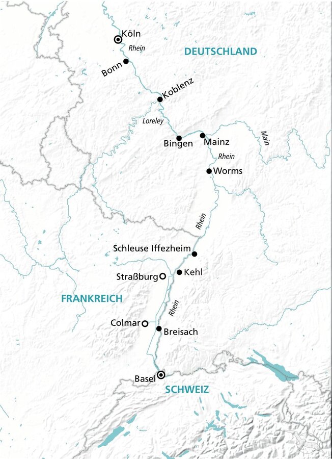 Mit unserem komfortablen First-Class-Schiff Asara erleben Sie eine 6-tägige Dreiländer-Kreuzfahrt auf dem zauberhaften Rhein. Freuen Sie sich auf eine abwechslungsreiche Flusskreuzfahrt mit besonderen Höhepunkten an Land. Ihre Reise beginnt in der Kulturmetropole Basel und führt Sie über namhafte deutsche Städte wie das facettenreiche Straßburg, Mannheim, Worms, Mainz, Bingen und Koblenz. Ihre Reise endet in der schönen Stadt Köln.