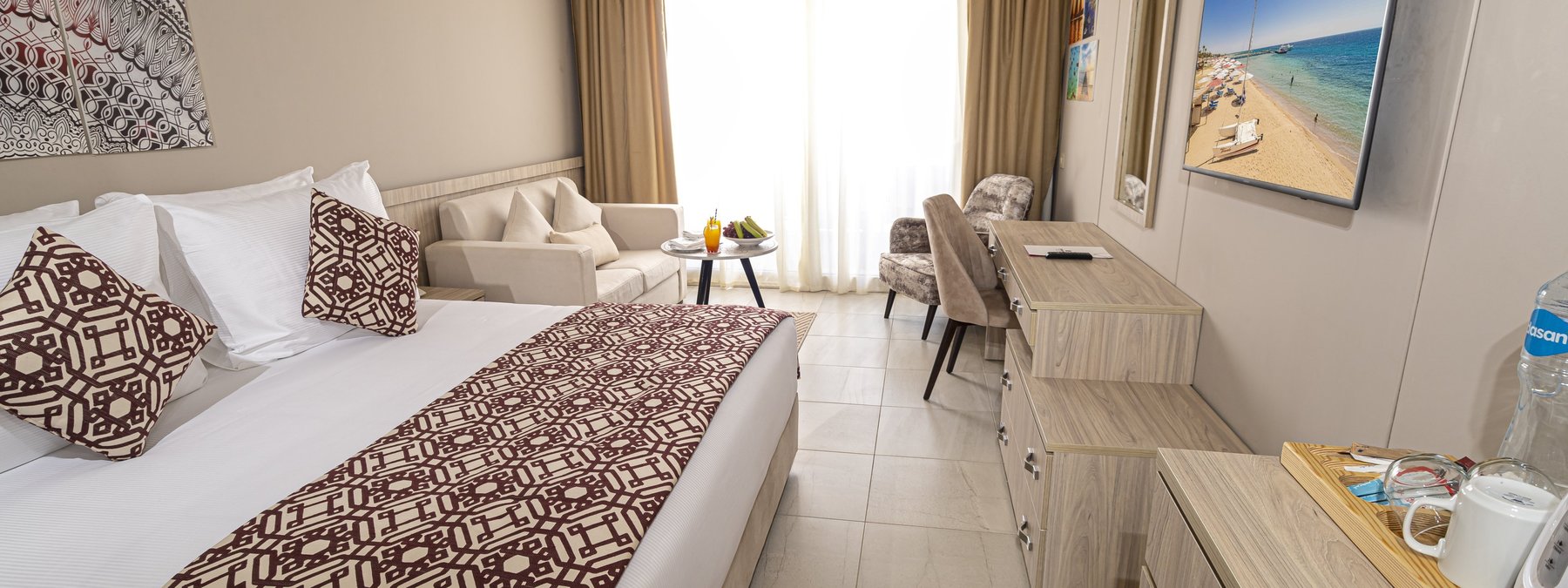 Deluxezimmer Meerblick (DMD) Bei gleicher Ausstattung noch komfortabler. Familienzimmer (FZ) Bei gleicher Ausstattung wie die Doppelzimmer mit zusätzlich abgetrennter Schlafgelegenheit für Kinder im Eingangsbereich (zwei Sofabetten 180 x 90 cm).