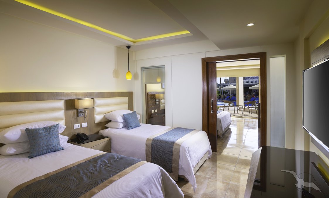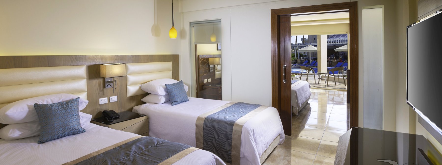 Familienzimmer (FZ) Ausgestattet wie die Bungalowzimmer (ca. 46 m²), jedoch mit zwei separaten Schlafzimmern, die durch eine Schiebetür getrennt sind. Wahleise mit Poolblick (FZP) buchbar.