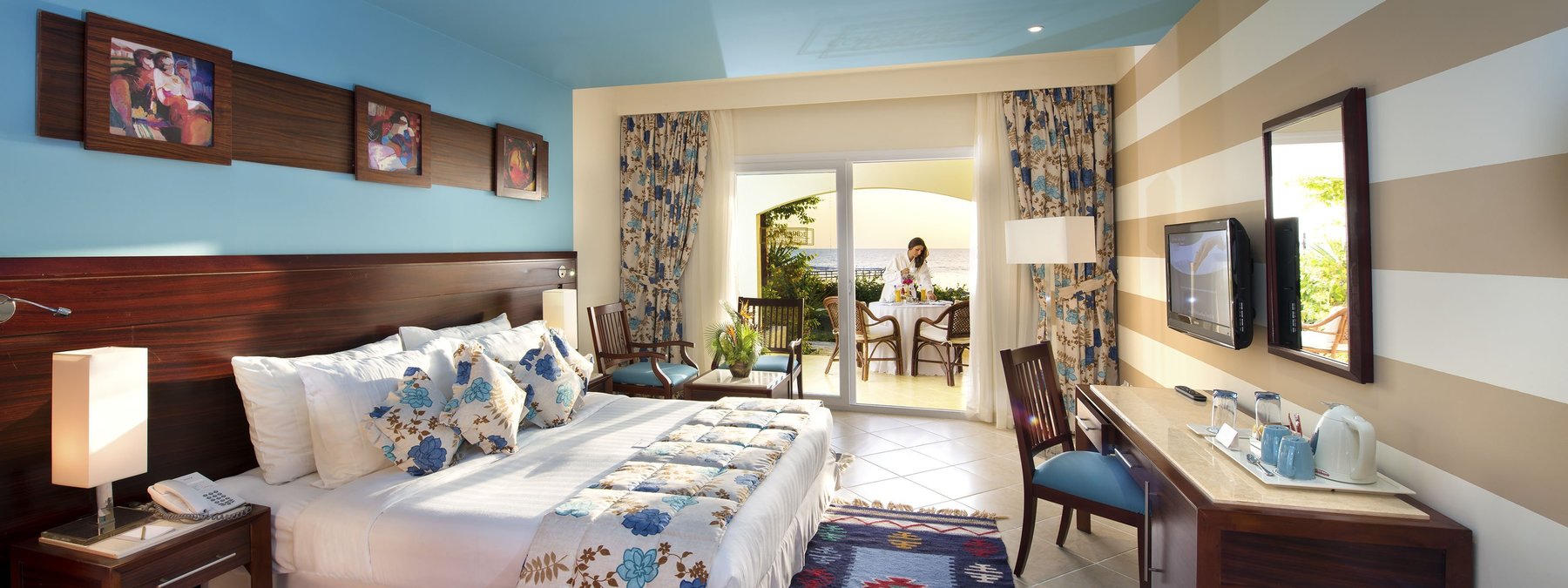 Doppelzimmer (DZ) komfortabel eingerichtet, mit Klimaanlage, Bad/Dusche/WC, Föhn, Telefon, SAT-TV, Kaffee-/Teezubereiter, Safe, Minibar (geg. Gebühr), Sitzecke und Balkon oder Terrasse. Wahlweise mit Meerblick (DZM) oder als Beach Front Zimmer (DZB) in erster Reihe zum Strand gelegen, buchbar.