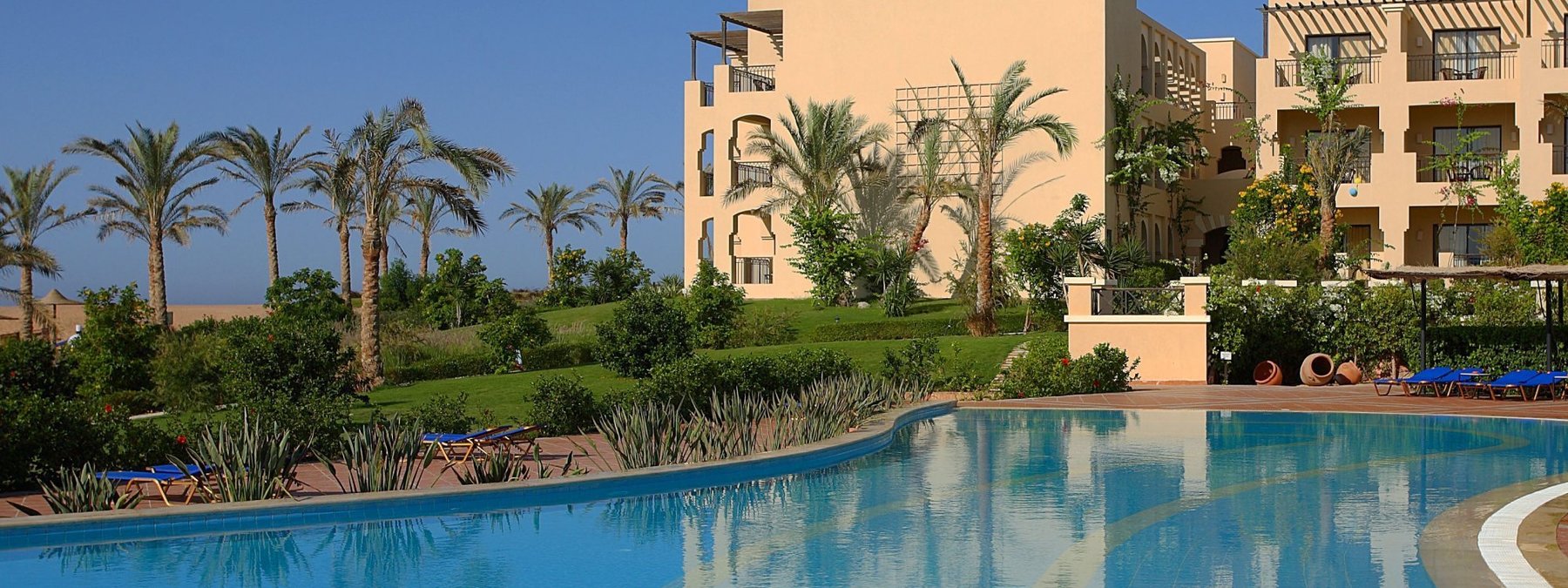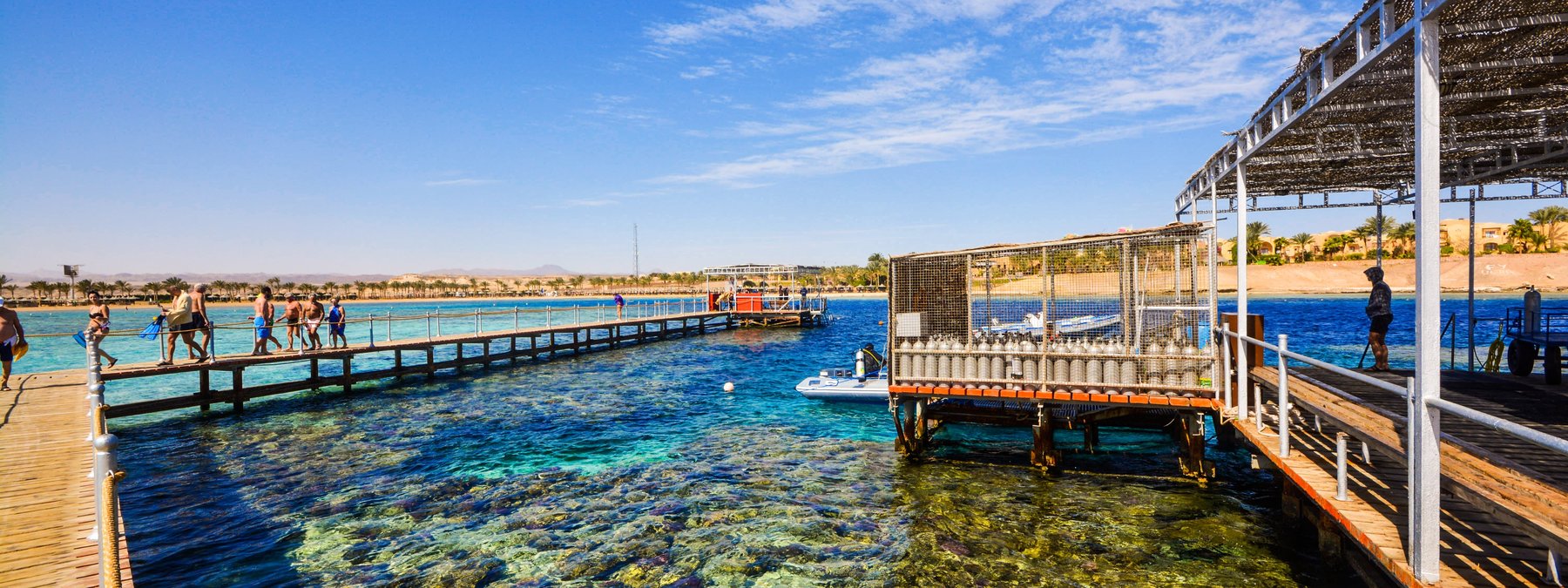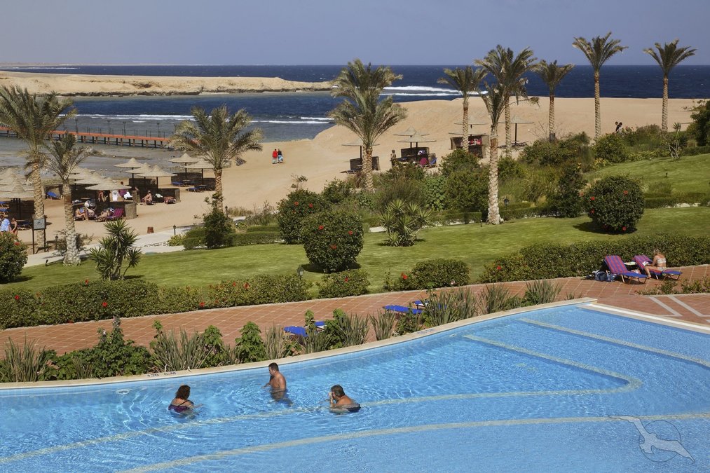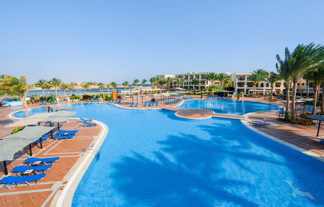 Direkt am langen Strand und am Hausriff der Coraya Bay gelegen. Korallen wachsen stellenweise bis in Ufernähe (Badeschuhe empfohlen). Ein Steg führt in tieferes Gewässer, wo Sie ideale Tauch- und Schnorchelbedingungen vorfinden. Flach abfallendes Wasser für einen direkten Einstieg ins Meer (ca. 150 m vom Hotel entfernt). Bis ins Zentrum von El Quseir sind es ca. 67 km, zum Flughafen ca. 5 km.