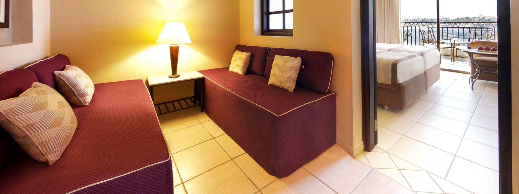 Familienzimmer Deluxe (FZD) Bei gleicher Ausstattung wie Superiorzimmer, 45m² groß mit separatem Schlafraum (2 Sofabetten) durch eine Falttür abgetrennt. Wahlweise mit Poolblick (FDP) oder Meerblick (FDM) buchbar.