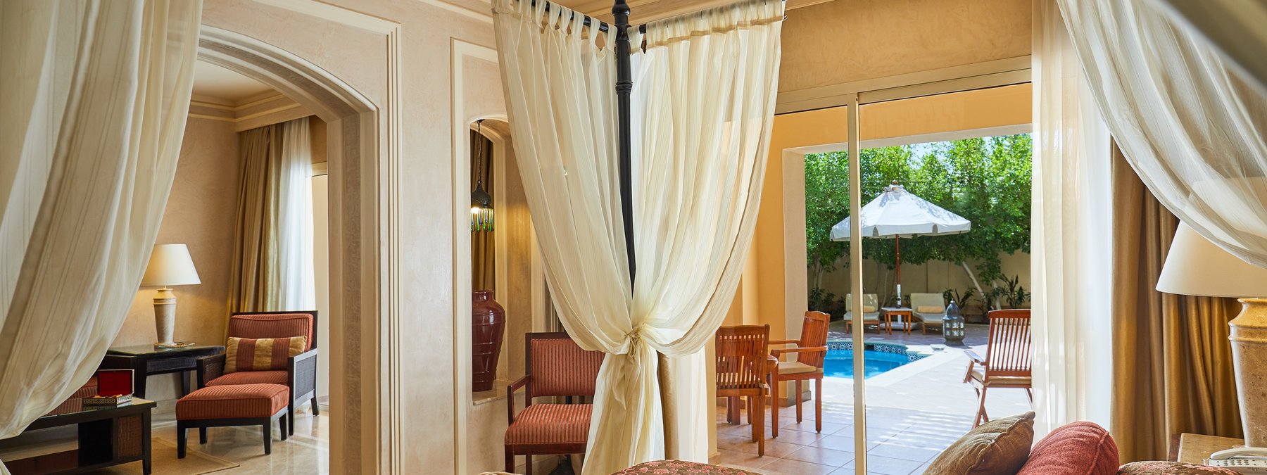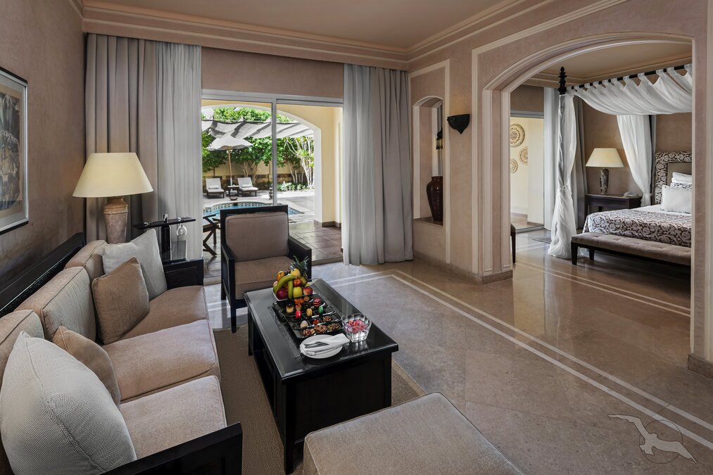 Royal Suite (SU) Verfügt über einen kombinierten Wohn-/Schlafraum und zusätzlich mit getrenntem Bad/Dusche und WC, Multi-Media-TV und DVD-Player sowie großzügiger Terrasse mit privatem Swimmingpool ausgestattet (inkl. Terrasse ca. 80 m²). Mindestalter in den Suiten 18 Jahre.