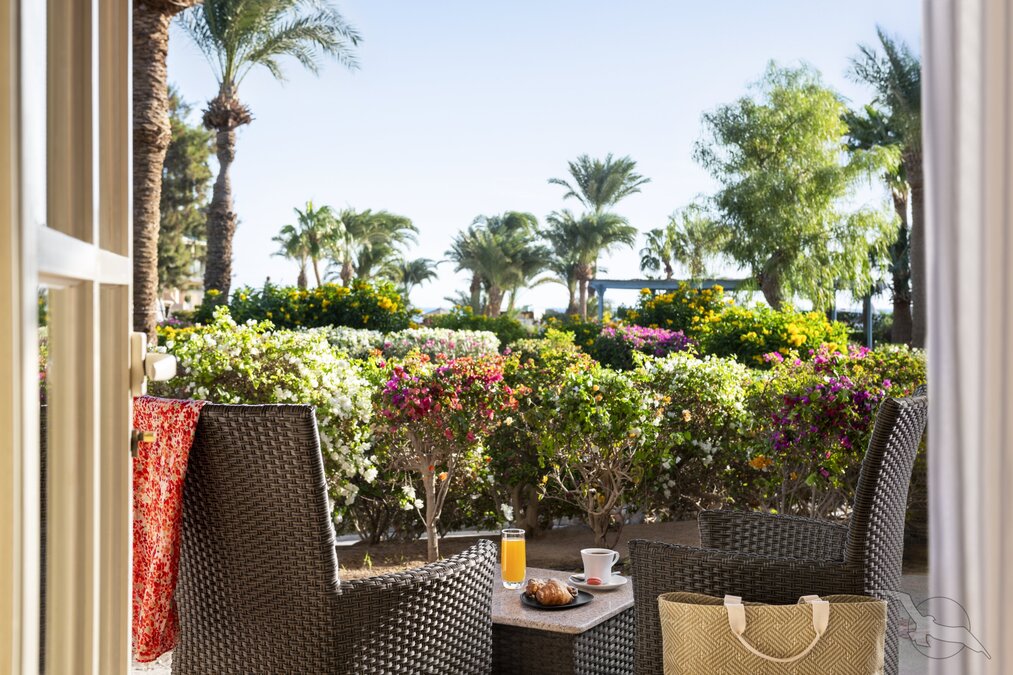 Doppelzimmer (DZ) Großzügig und komfortabel eingerichtet (ca. 40 m²), mit Klimaanlage, Dusche/WC, Föhn, Telefon, SAT-TV, WLAN, Safe, Kaffee-/Teezubereiter, Minibar und Terrasse mit Gartenblick.