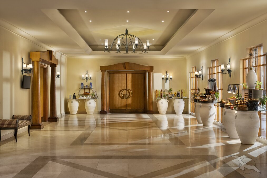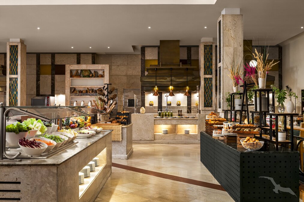 Im mediterranen Stil erbaute Hotelanlage mit Haupthaus sowie zwei- bis viergeschossigen Nebengebäuden mit Eingangshalle, WLAN in der Lobby (inklusive), Buffetrestaurant, mehrere à la carte Restaurants (darunter Fisch- und italienische Spezialitäten), zwei Poolrestaurants, Bar sowie Geschäfte. In der weitläufigen, üppig bewachsenen Gartenanlage befinden sich drei Swimmingpools (zwei beheizbar) sowie zwei Kinderpools mit Sonnenterrasse und eine Poolbar. Liegen, Sonnenschirme und Badetücher sind an Pool und Strand inklusive.