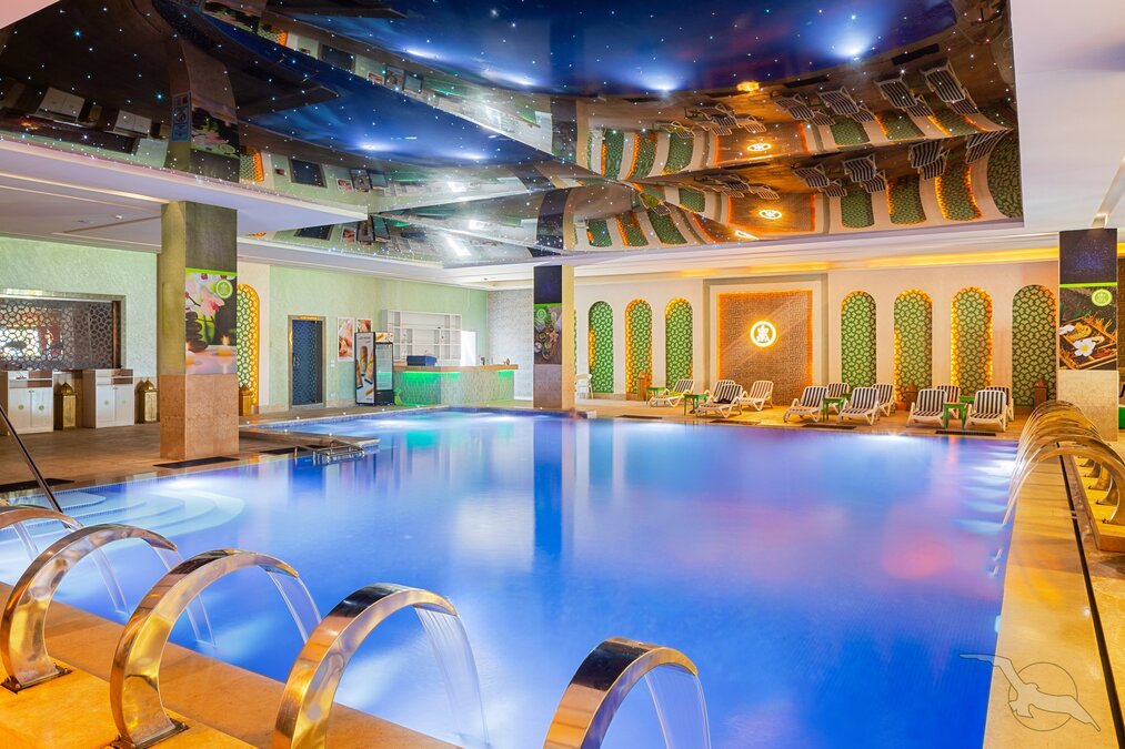 Um die sehr große und fantasievoll gestaltete Swimmingpoollandschaft liegen die unterschiedlichen Wohneinheiten teilweise im Bungalowstil (einstöckig oder ebenerdig) und Doppelzimmereinheiten. Eingangshalle mit Rezeption/Lobby, WLAN in der gesamten Anlage (inklusive), mehrere Bars, 12 Themen-Buffetrestaurants (z.B. orientalisch, deutsch, mediterran, asiatisch, italienisch) die innerhalb der all inclusive-Leistung zur Auswahl stehen. Im hinteren Teil der Anlage liegt der große Neverland Aquapark mit insgesamt 38 Swimmingpools (saisonal beheizbar), separatem Kinderpool und insgesamt 85 Rutschen für Groß & Klein, Sonnenterrassen und Pool-/Snackbar. Eine weitere Snackbar befindet sich am Strand des Pickalbatros Dana Beach Resort. Liegen, Sonnenschirme und Badetücher sind an Pool und Strand inkl., Ausgabe der Badetücher am Pool.