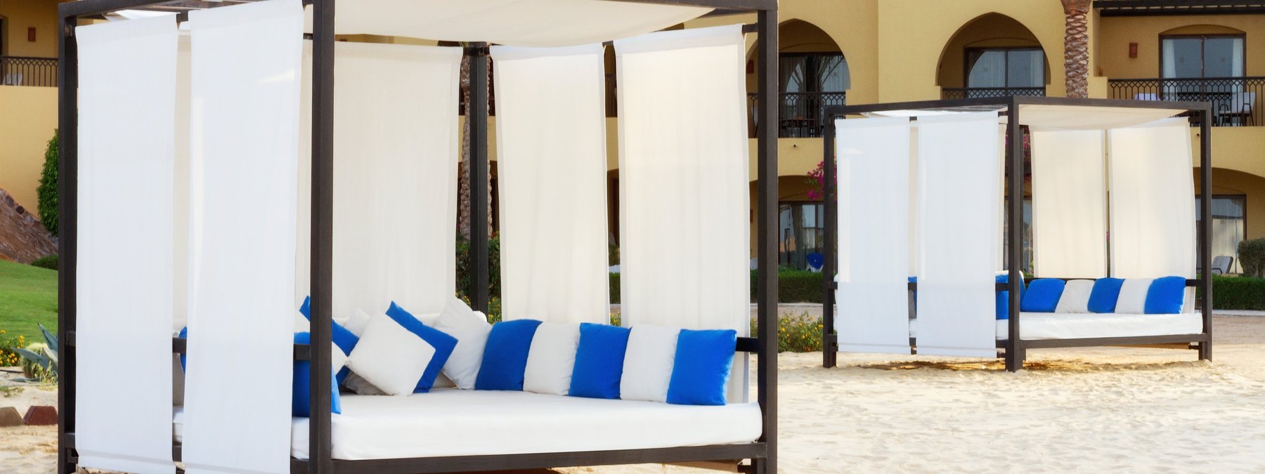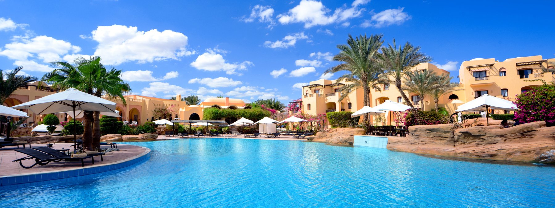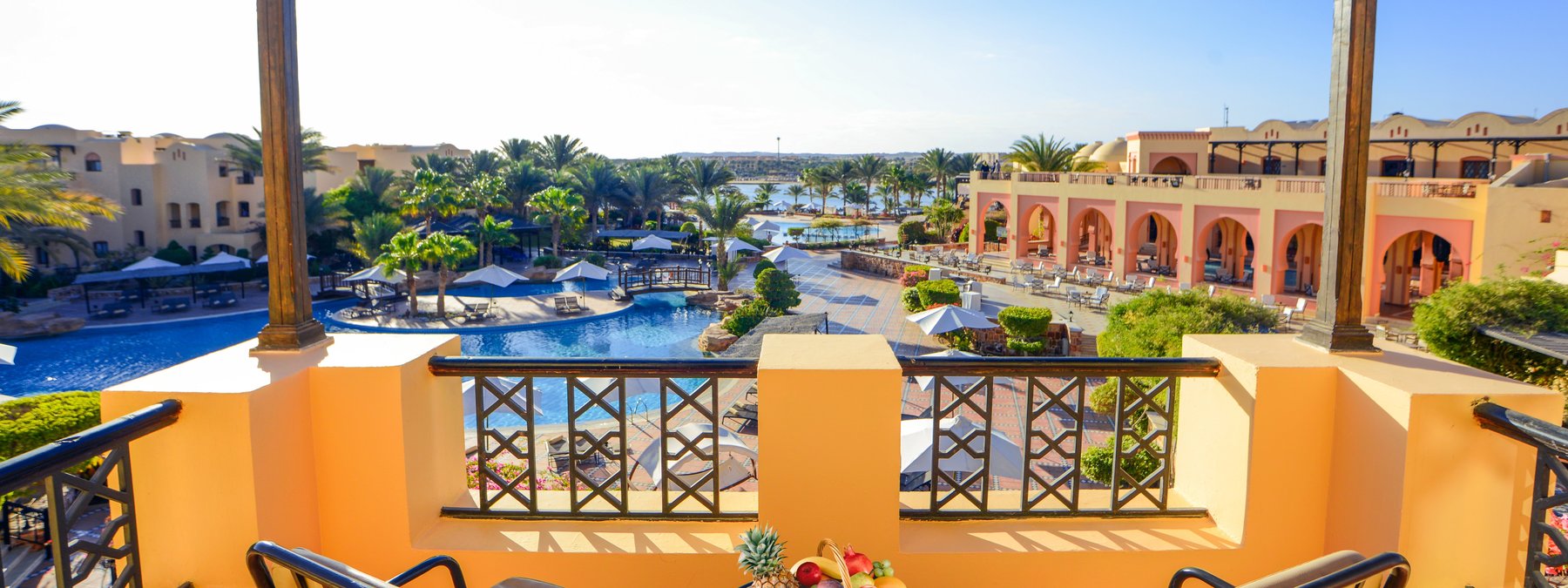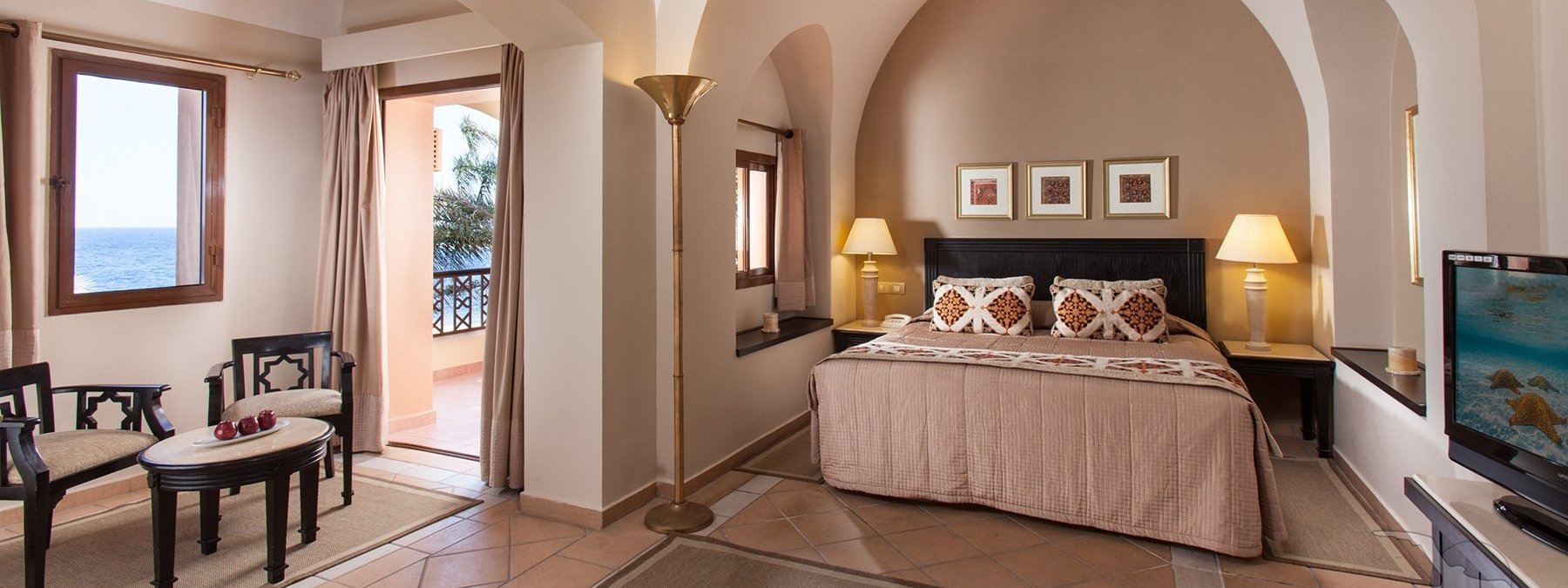 Direkt am langen Sandstrand und am Hausriff der Coraya Bay gelegen. Korallen wachsen stellenweise bis in Ufernähe (Badeschuhe empfohlen). Beste Schnorchel- und Tauchbedingungen. Flach abfallendes Wasser für einen direkten Einstieg ins Meer (ca. 150 m vom Hotel entfernt). Bis ins Zentrum von El Quseir sind es ca. 67 km, zum Flughafen ca. 7 km.
