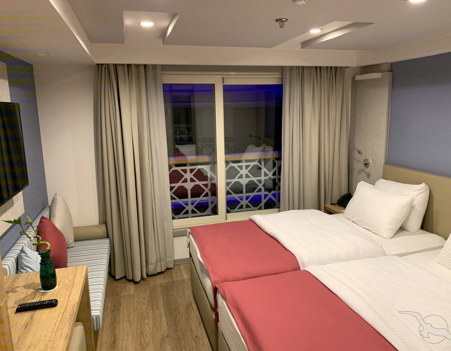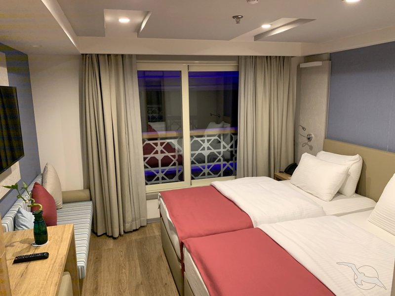 Alle Kabinen liegen außen, sind modern und komfortabel in Design und Ausstattung und verfügen über einen kleinen Balkon mit Sitzgelegenheit. Ausstattung: Sessel bzw. Sitzecke, Dusche/WC, Föhn, regulierbare Klimaanlage, SAT-TV, Musik-, Film- und Dokumentationskanal, Schiffstelefon, Privatsafe, Kabinenservice, Kühlschrank, Teekocher. 220 Volt Wechselstrom. Kabinengröße ca. 16 m².