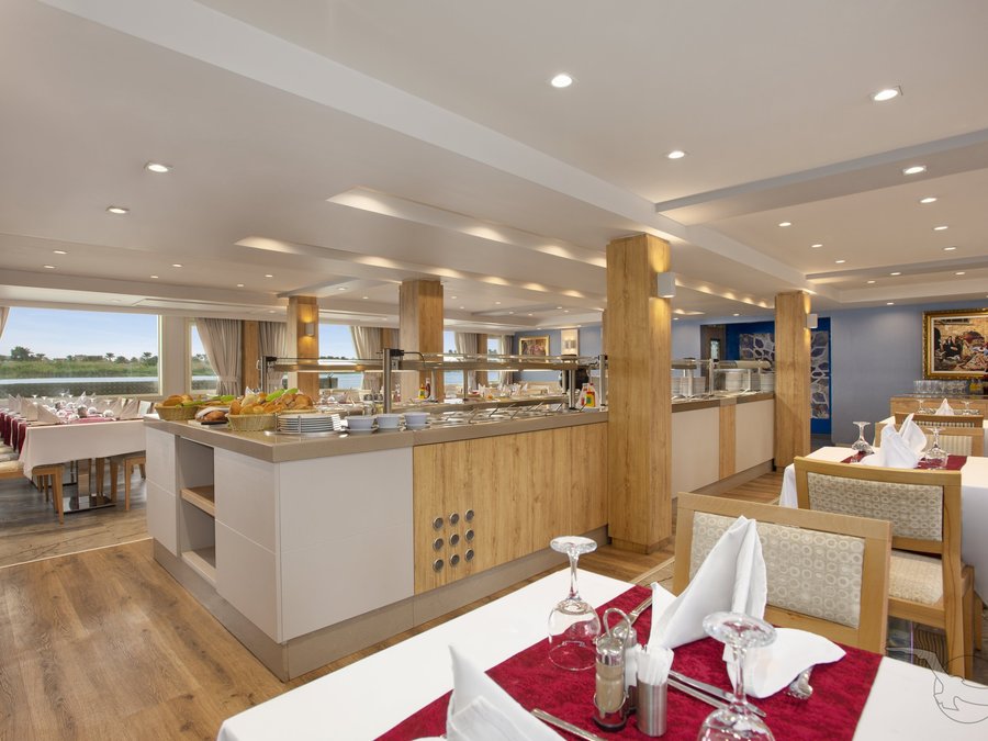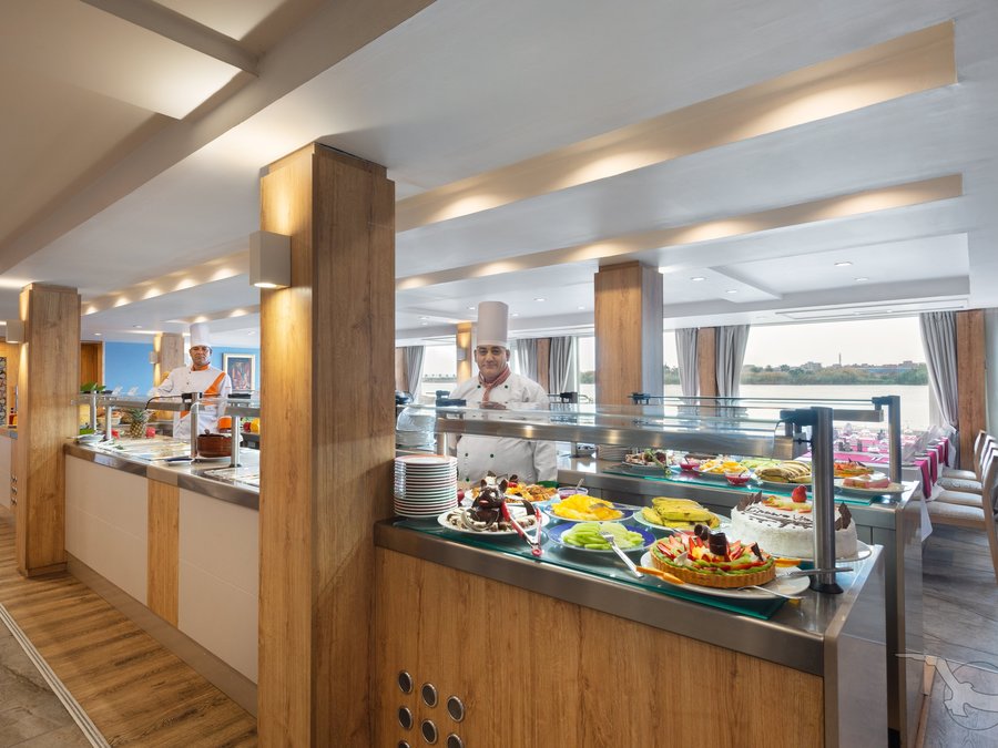 Unsere Nilschiffe verfügen über komfortable und geschmackvoll eingerichtete Restaurants. Ein aufmerksames Restaurant- und Küchenteam kümmert sich mit internationalen und einheimischen Gerichten, die liebevoll in Buffetform serviert werden, um Ihr kulinarisches Wohlergehen. Die zu Beginn der Reise gewählten Sitzplätze werden in der Regel beibehalten.