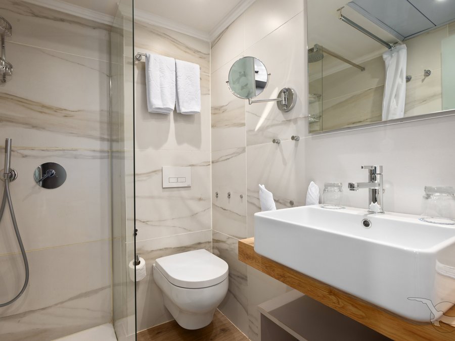Die Kabine liegt außen und im Bugbereich, ist modern und komfortabel in Design und Ausstattung und verfügt über einen kleinen Balkon mit Sitzgelegenheit. Ausstattung: Sessel bzw. Sitzecke, Dusche/WC, Föhn, regulierbare Klimaanlage, SAT-TV, Musik-, Film- und Dokumentationskanal, Schiffstelefon, Privatsafe, Kabinenservice, Kühlschrank, Teekocher. 220 Volt Wechselstrom. Kabinengröße ca. 28 qm.