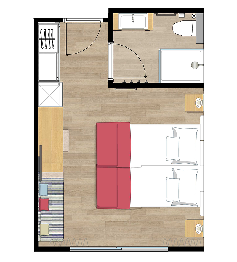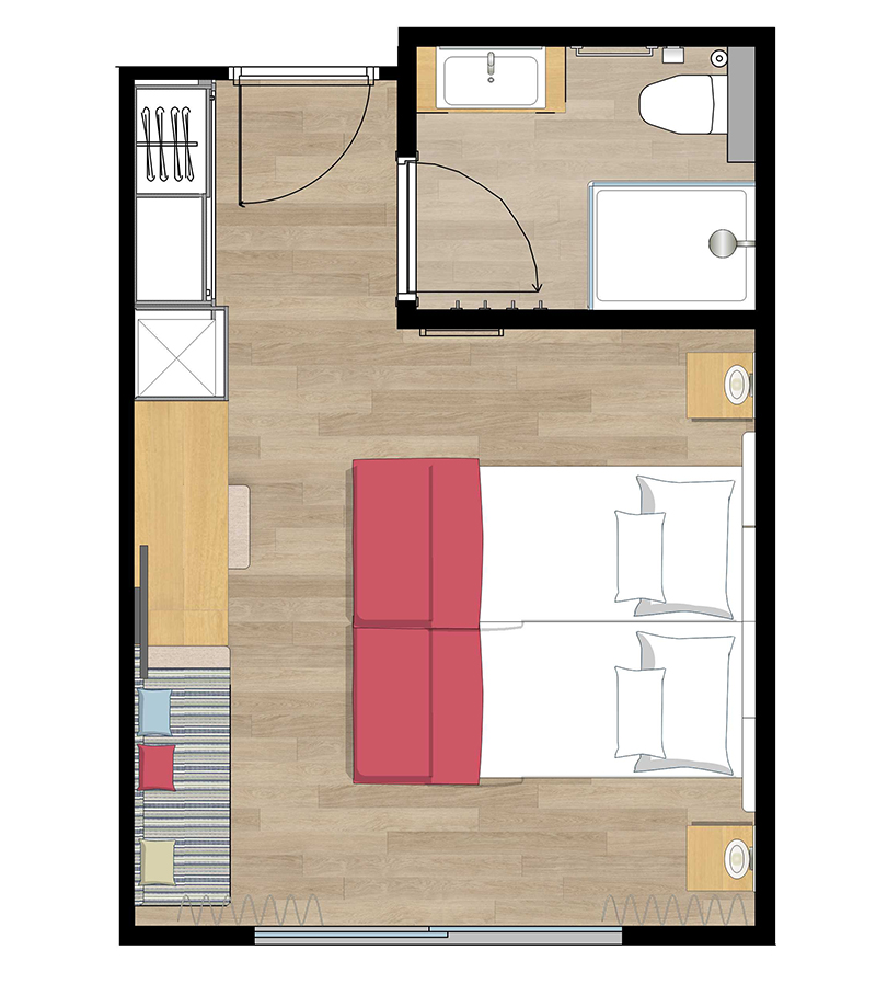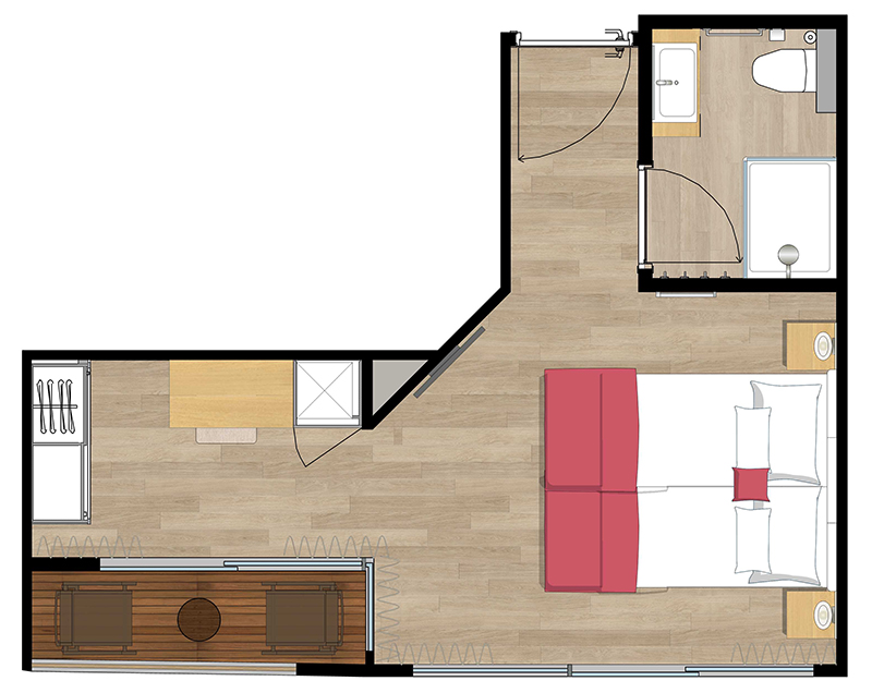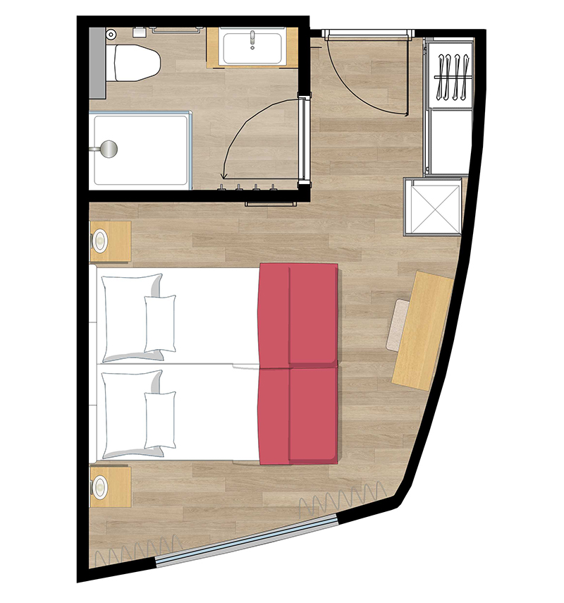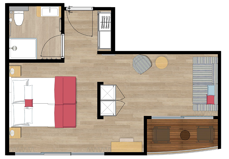 Die Kabine liegt außen und im Bugbereich, ist modern und komfortabel in Design und Ausstattung und verfügt über einen kleinen Balkon mit Sitzgelegenheit. Ausstattung: Sessel bzw. Sitzecke, Dusche/WC, Föhn, regulierbare Klimaanlage, SAT-TV, Musik-, Film- und Dokumentationskanal, Schiffstelefon, Privatsafe, Kabinenservice, Kühlschrank, Teekocher. 220 Volt Wechselstrom. Kabinengröße ca. 22 qm.