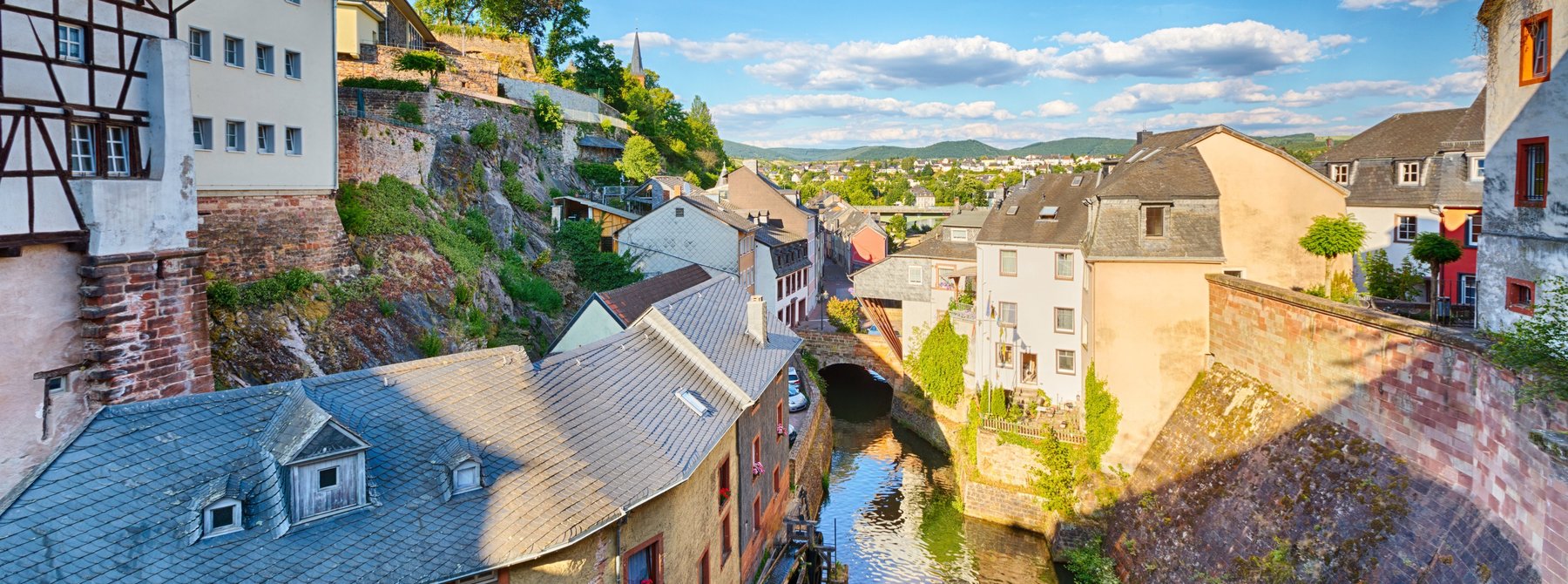 Saarburg wurde im Jahre 964 von Graf-Siegfried von Luxemburg mit dem Bau der Burg hoch über der Saar gegründet. Die idyllische Kleinstadt ist von Wäldern und Weinbergen umgeben und wird vom Leukbach durchflossen. Eine besondere Attraktion ist der 20 m hohe Wasserfall inmitten der Stadt, der zwischen Fachwerkhäusern und Barockbauten zu Tal stürzt und die Mühlräder der ehemaligen Hachenberger Mühle antreibt. Saarburgs alter Kern und die pittoreske Unterstadt haben reizvolle Winkel zu bieten und laden zu Entdeckungstouren entlang der steilen und verwinkelten Gassen ein.