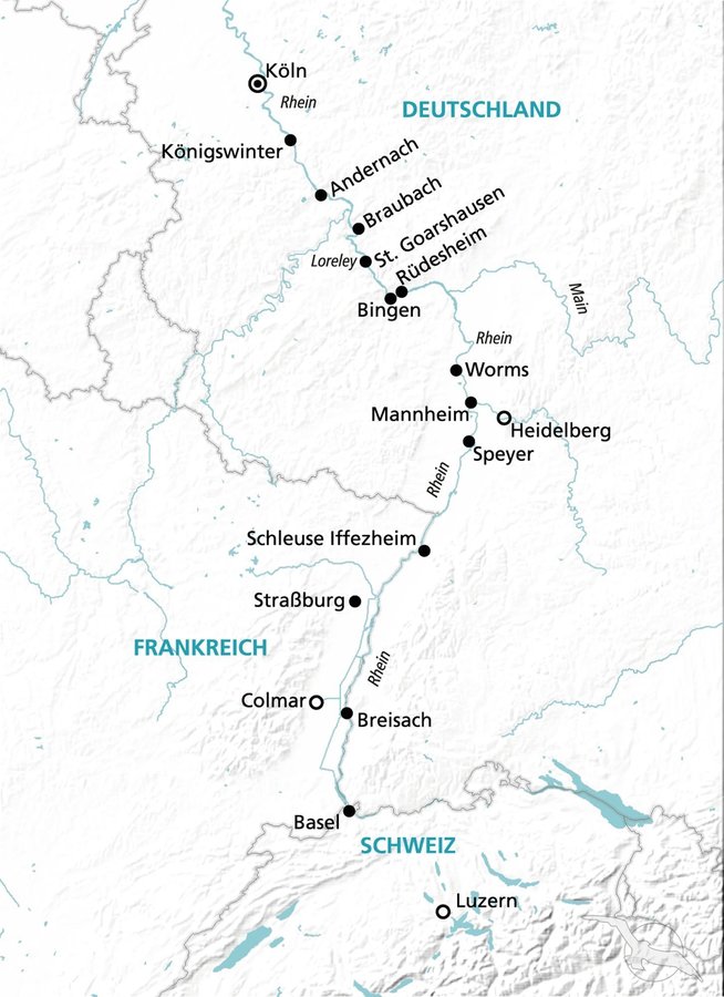 Freuen Sie sich auf Ihre neuntägige Reise zu den Schätzen am Rhein mit unserer MS Swiss Crystal. Sie werden am Nachmittag herzlich an Bord willkommen geheißen. Kurz darauf beginnt die Fahrt nach Königswinter mit der Möglichkeit zu einem Abendspaziergang. Am nächsten Tag bieten wir auf einem Ausflug die Besichtigung der Marksburg an. In Rüdesheim sollten Sie sich den Besuch eines Weinlokales nicht entgehen lassen. Anschließend steht mit Heidelberg, Speyer und Straßburg wieder Kultur auf dem Programm. Die Sehenswürdigkeiten der einzelnen Städte, wie z.B. das Heidelberger Schloss oder der Dom von Speyer, gehören ebenso zu den Höhepunkten auf dieser Reise wie sicherlich die Schweiz mit Basel, Colmar und Luzern am Vierwaldstätter See. Auf der Rückfahrt geht es durch die wunderschöne Rheinlandschaft mit Besuchen in Worms, St. Goarshausen und Andernach, bevor Sie nach einer erlebnisreichen Reise wieder Köln erreichen.