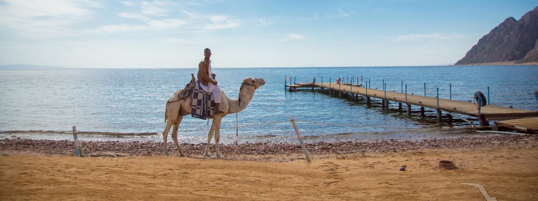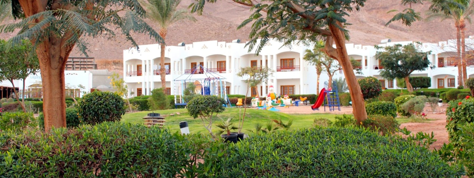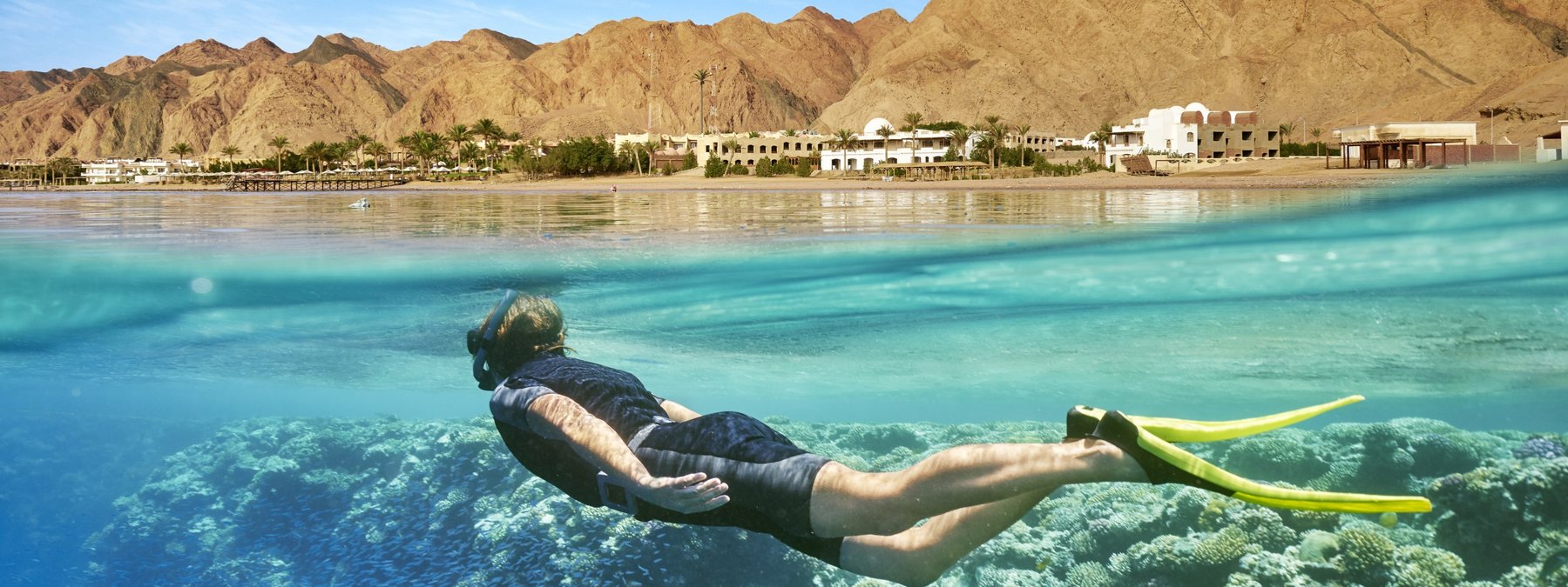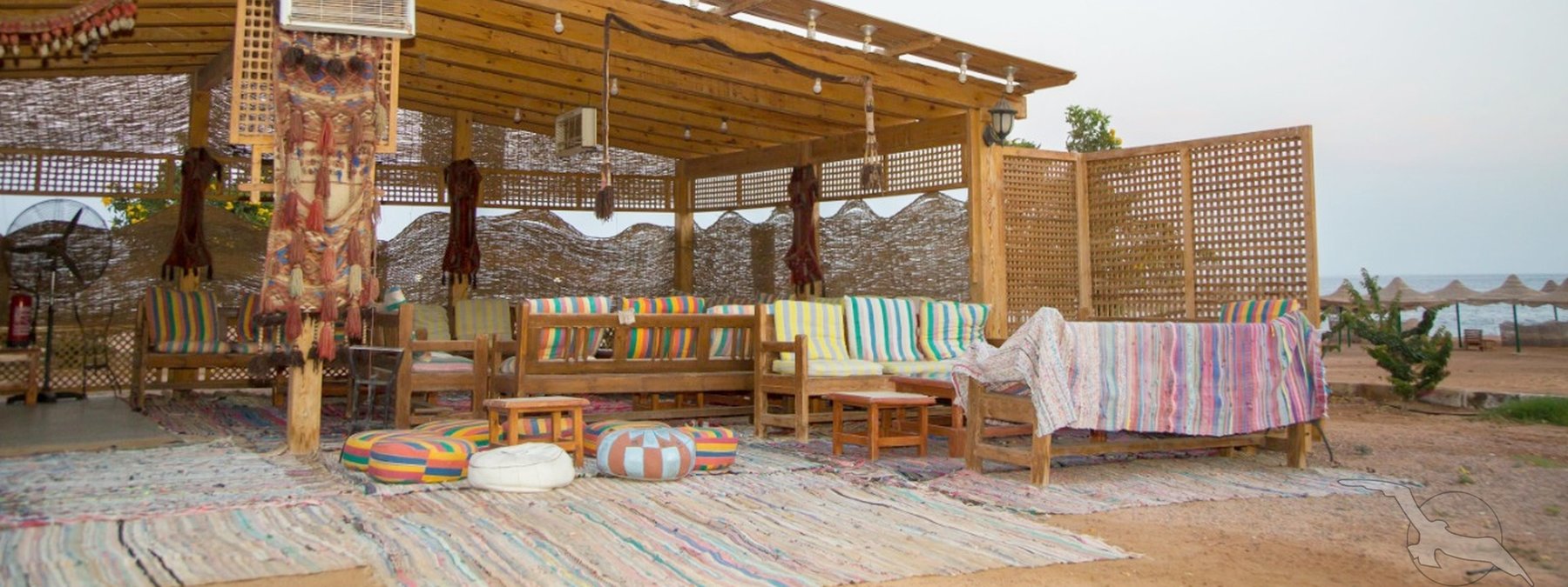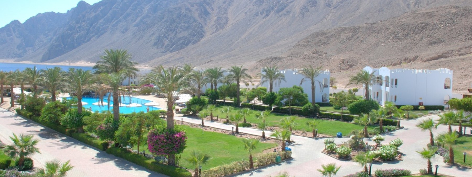 Direkt am hoteleigenen Sandstrand mit hervorragendem Hausriff. Das malerische Terrain steht unter Naturschutz. Ein kurzer Badesteg führt über die Korallen in tieferes Gewässer (Badeschuhe empfohlen). Zum Ortszentrum von Dahab sind es 6 km (Shuttle inklusive, 3x täglich). Sharm-el-Sheikh ist ca. 70 Fahrminuten entfernt.