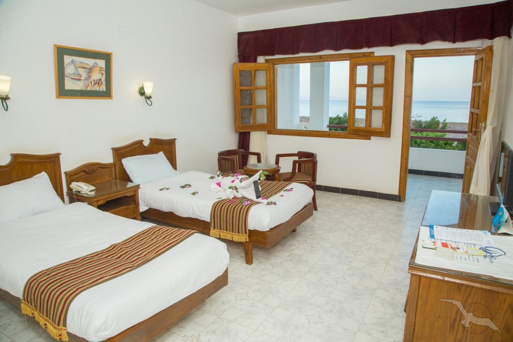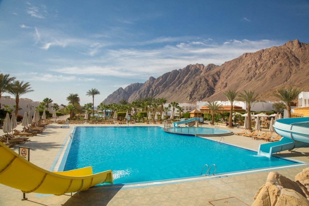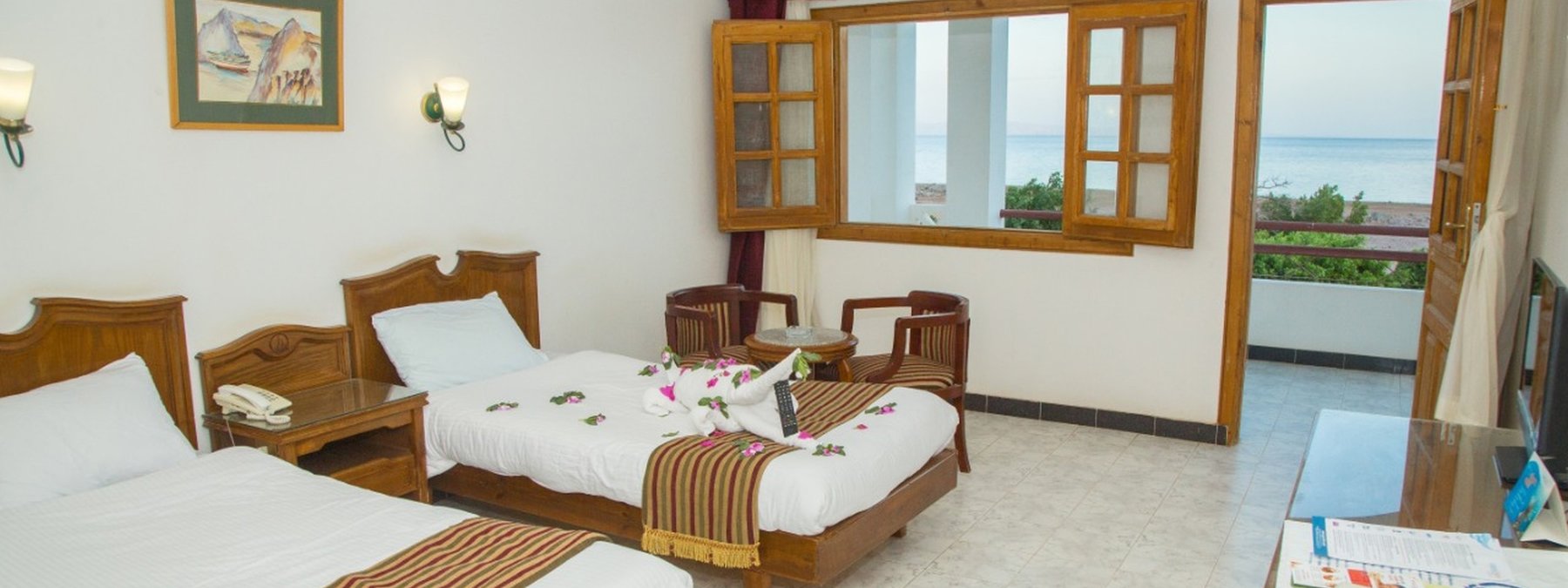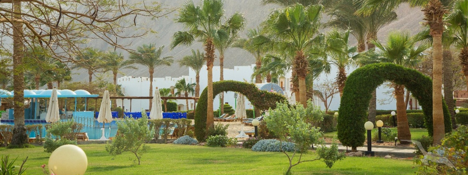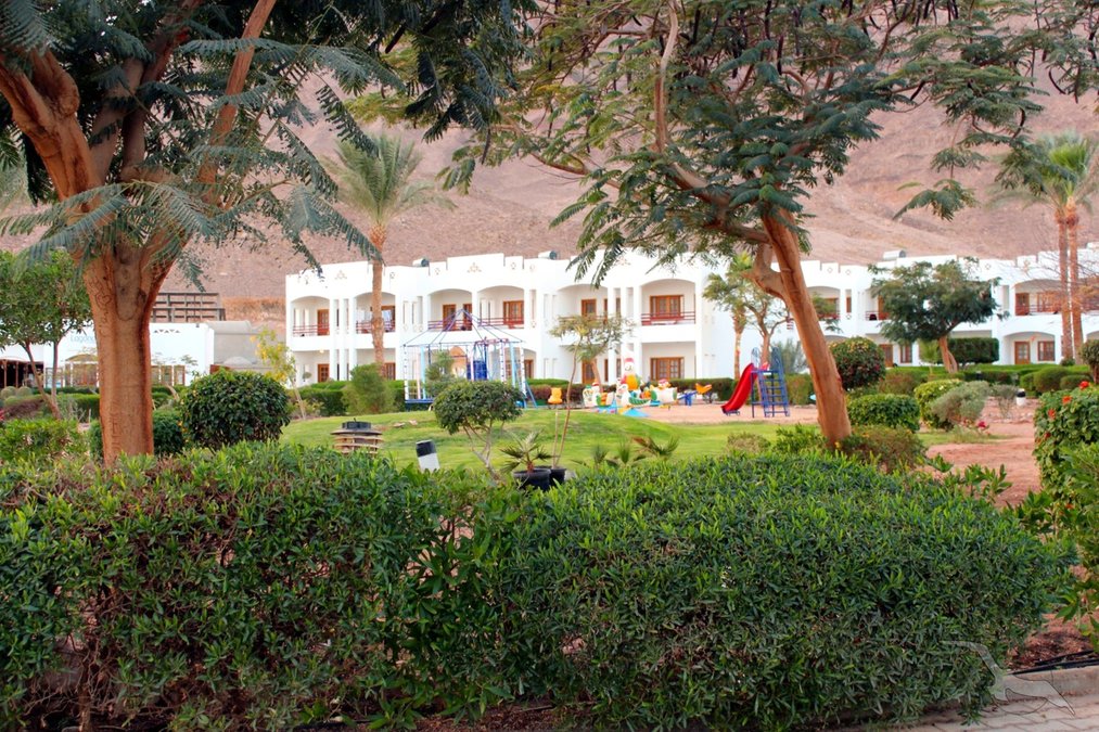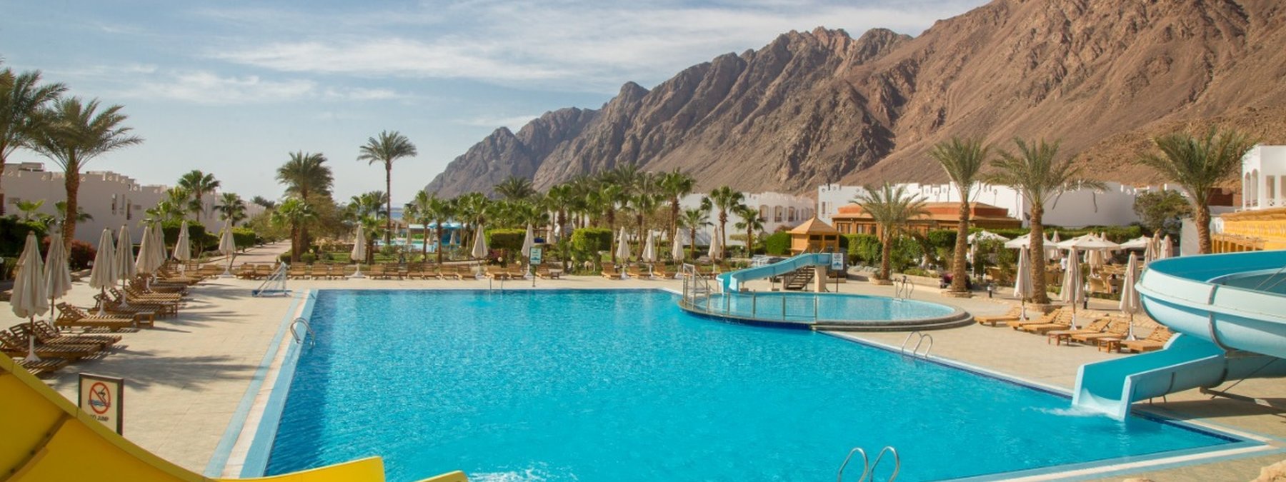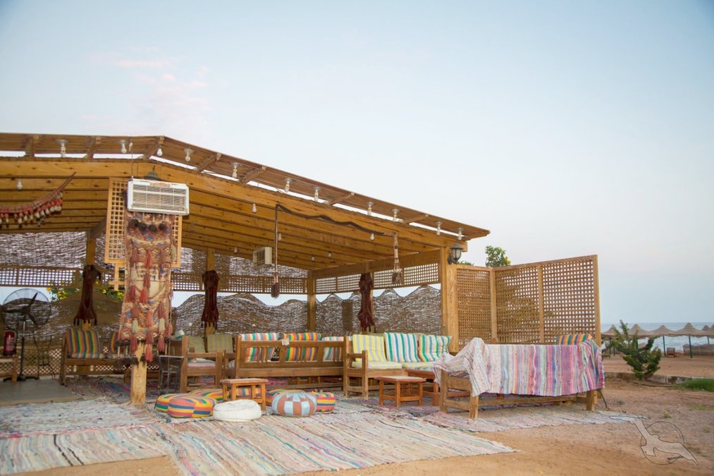 Direkt am hoteleigenen Sandstrand mit hervorragendem Hausriff. Das malerische Terrain steht unter Naturschutz. Ein kurzer Badesteg führt über die Korallen in tieferes Gewässer (Badeschuhe empfohlen). Zum Ortszentrum von Dahab sind es 6 km (Shuttle inklusive, 3x täglich). Sharm-el-Sheikh ist ca. 70 Fahrminuten entfernt.