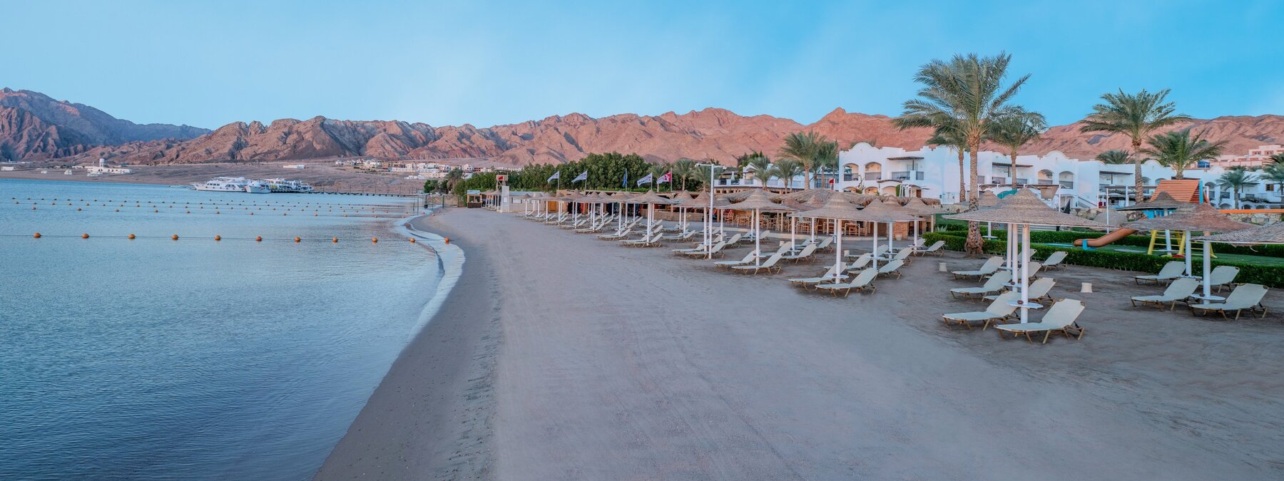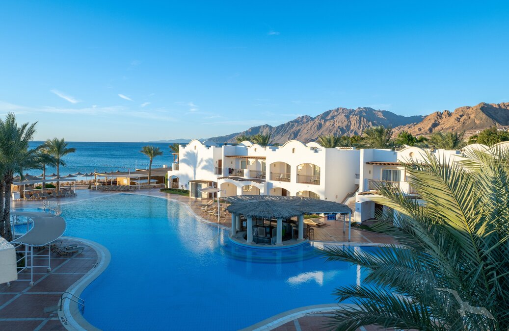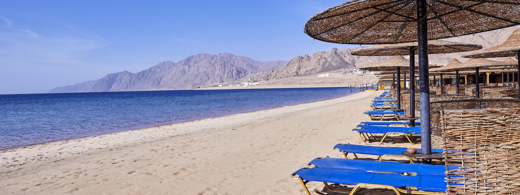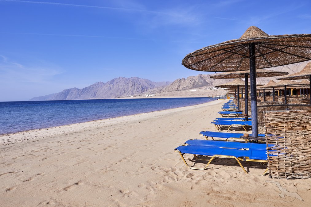 Direkt am schönen, flachabfallenden Sandstrand der langgezogenen Bucht am Fuße des Sinai-Gebirges. Zum Ortszentrum von Dahab sind es 4 km (Shuttle 2x täglich inklusive). Sharm-el-Sheikh ist ca. 90 Fahrminuten entfernt.