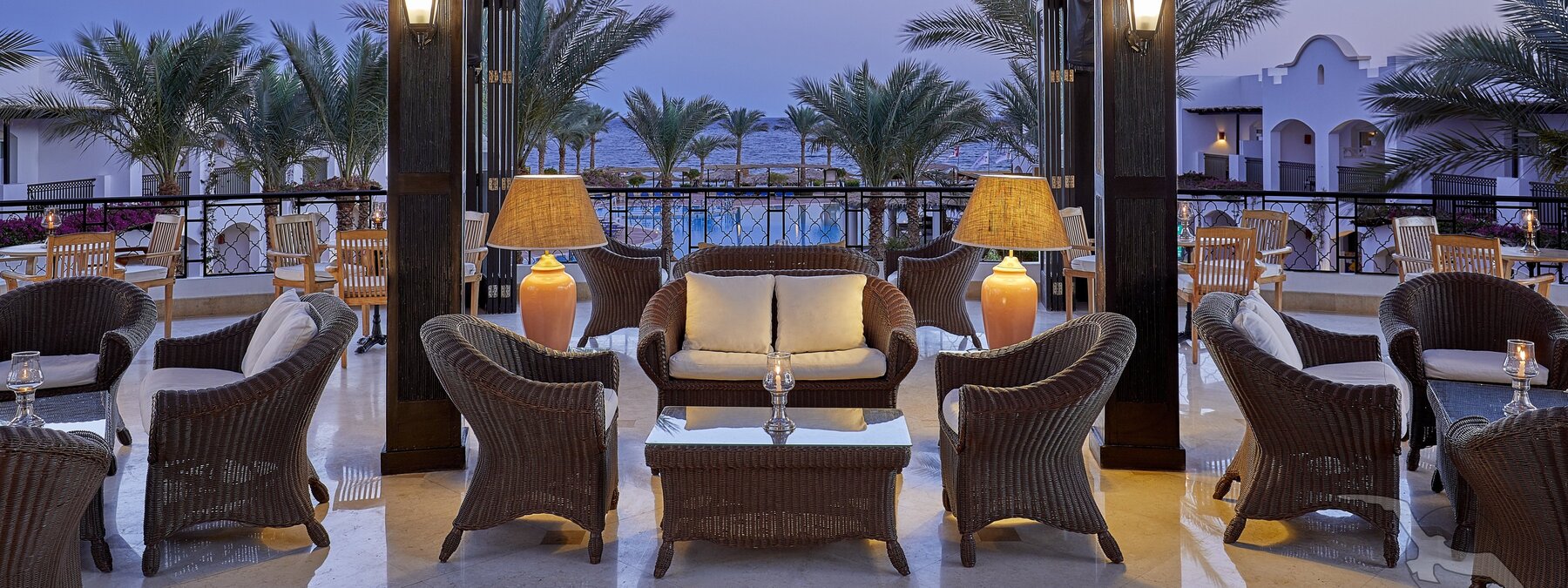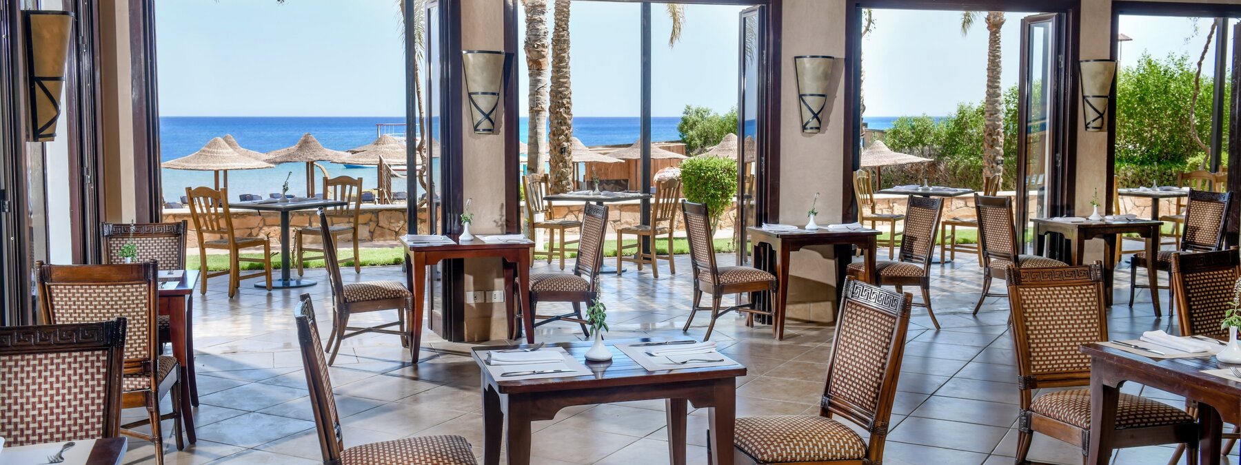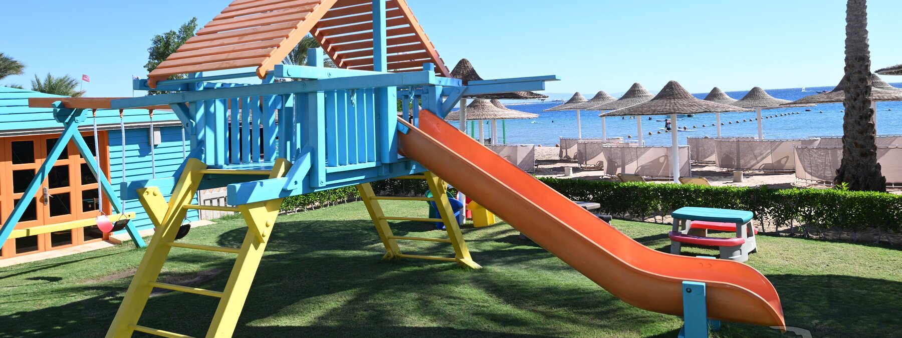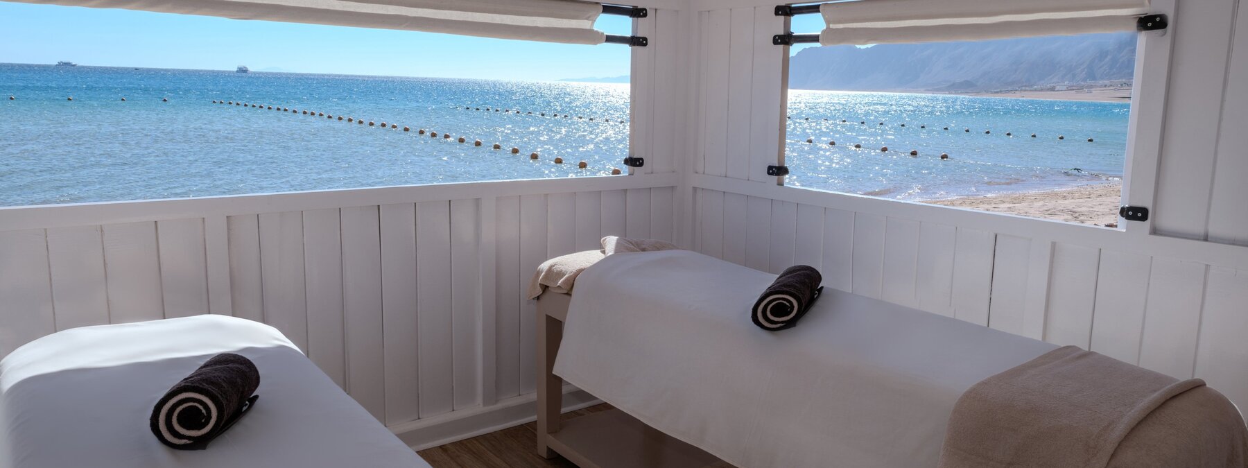 Direkt am schönen, flachabfallenden Sandstrand der langgezogenen Bucht am Fuße des Sinai-Gebirges. Zum Ortszentrum von Dahab sind es 4 km (Shuttle 2x täglich inklusive). Sharm-el-Sheikh ist ca. 90 Fahrminuten entfernt.
