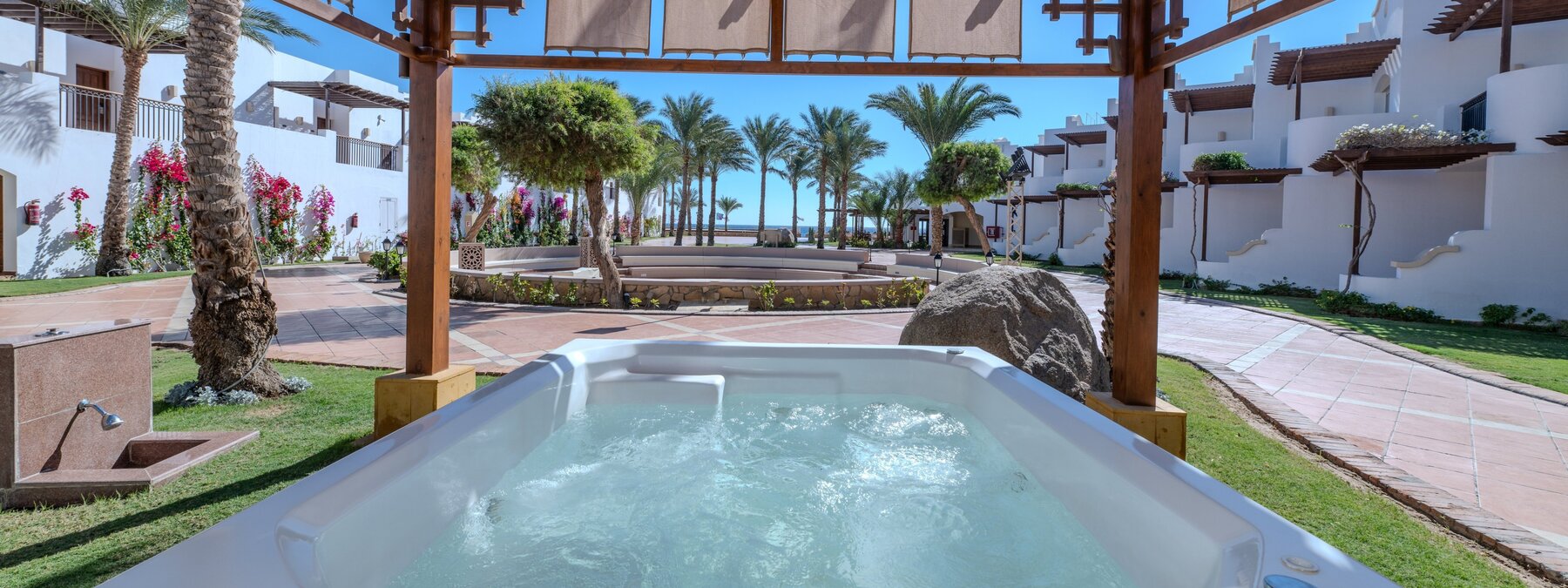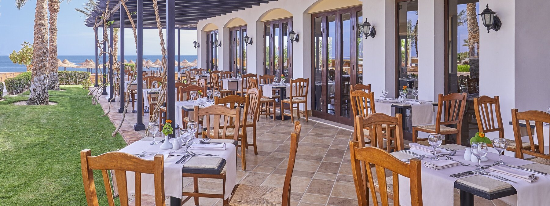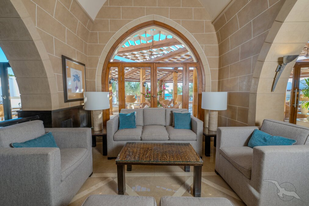 Das von der eindrucksvollen Bergkulisse umgebene Hotel bietet eine Rezeption, Lobbybar, WLAN (in den öffentlichen Bereichen inklusive, begrenzte Geschwindigkeit) kleine Geschäfte, Hauptrestaurant, a-la-carte Restaurant. Die doppelstöckigen Reihenbungalows umschließen zu beiden Seiten die begrünte Außenanlage mit geschmackvoll angelegtem großen Swimmingpool (beheizbar) und integriertem Kinderbecken, Sonnenterrasse, Snack-/Poolbar und Strandbar. Liegen, Sonnenschirme und Badetücher sind an Pool und Strand inklusive.