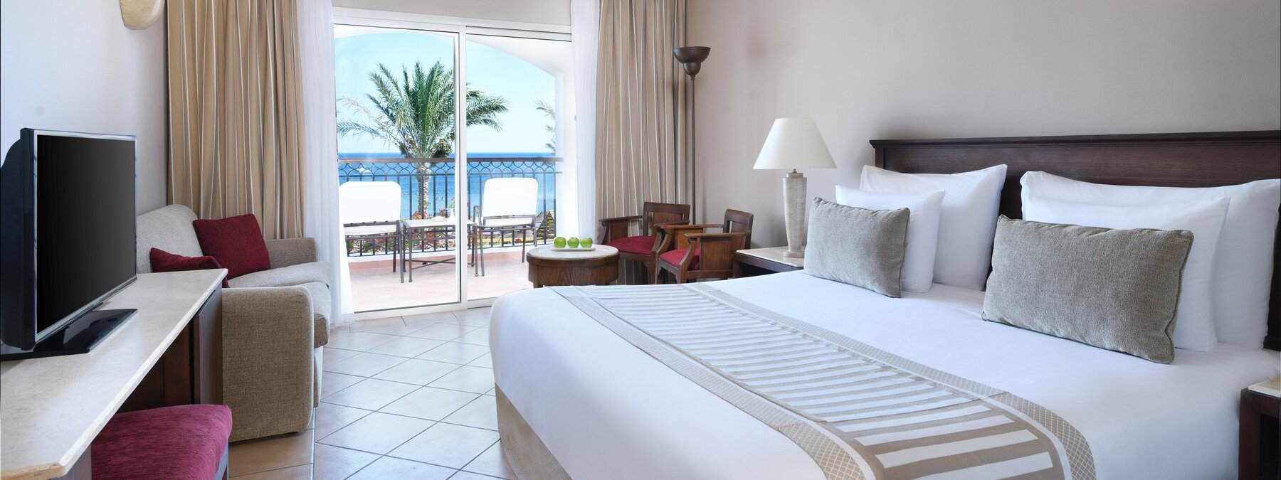 Superiorzimmer (DZS) geschmackvoll eingerichtet mit Klimaanlage, Dusche/ WC, Föhn, WLAN, Telefon, SAT-TV, Safe, Minibar (geg. Gebühr) und Balkon oder Terrasse mit Gartenblick. Wahlweise mit seitlichem Meerblick (DSS) oder direktem Meerblick (DMS) buchbar.