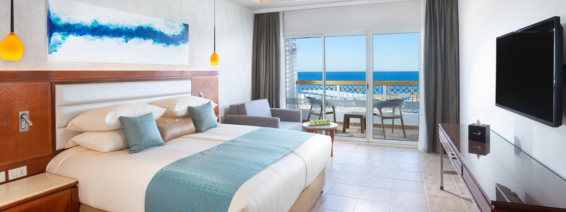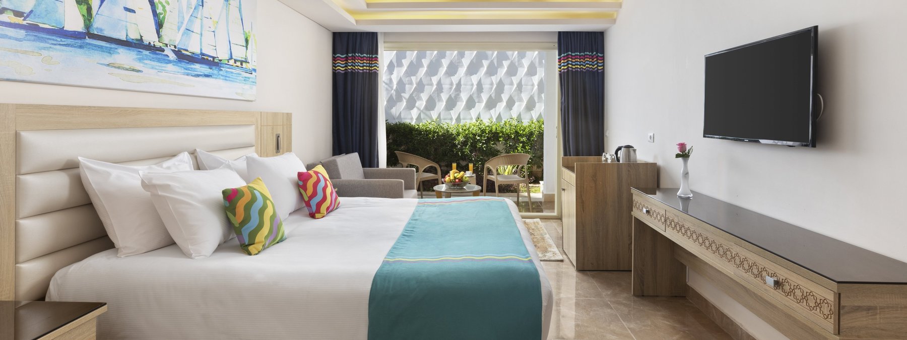 Doppelzimmer (DZ) Modern und geschmackvoll eingerichtet, mit Klimaanlage, Dusche/WC, Föhn, Telefon, SAT-TV, Safe, Minibar, WLAN und Balkon oder Terrasse zur Gartenseite. Wahlweise mit Poolblick (DZP), seitl. Meerblick (DKM) oder direktem Meerblick (DZM) buchbar.