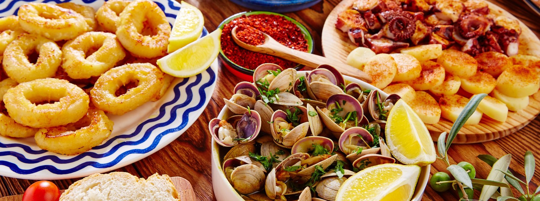 Die kleinen spanischen Vorspeisen, Tapas genannt, sind neben Paella, einer Reispfanne mit Meeresfrüchten und Gemüse, die bekanntesten Exportschlager Spaniens. Schauen Sie während Ihrer Spanien Kreuzfahrt auf Landausflügen ruhig einmal genauer hin. Gerade die etwas deftigeren Gerichte mit Eintöpfen und Fleisch gehören ebenfalls zum typisch spanischen Essen. Sie stammen aus der einfachen Küche der Bauern, die nach schwerer Arbeit eine gehaltvolle Mahlzeit brauchten. Gerade in den bergigen Regionen, im Landesinnern oder an der nördlichen Küste im Baskenland gibt es viele Eintopfgerichte, die „Pucheros“ mit Linsen, Bohnen und Speck. Ob Lamm, Huhn, Kaninchen, der berühmte Schinken vom Iberico-Schwein, frischer Fisch und Meeresfrüchte oder lecker in Öl eingelegtes Gemüse mit Oliven, die spanische Küche ist sehr vielfältig und hat weit über die Landesgrenzen zahlreiche Anhänger.