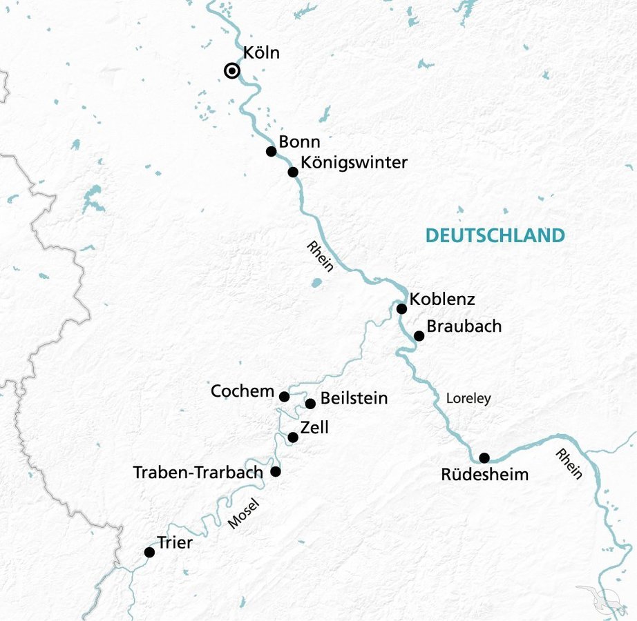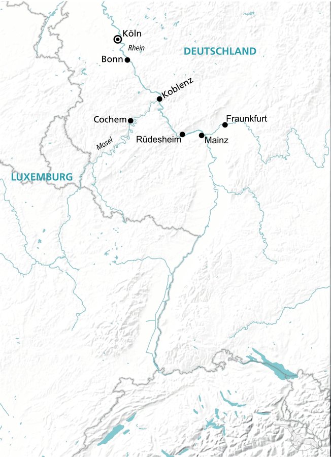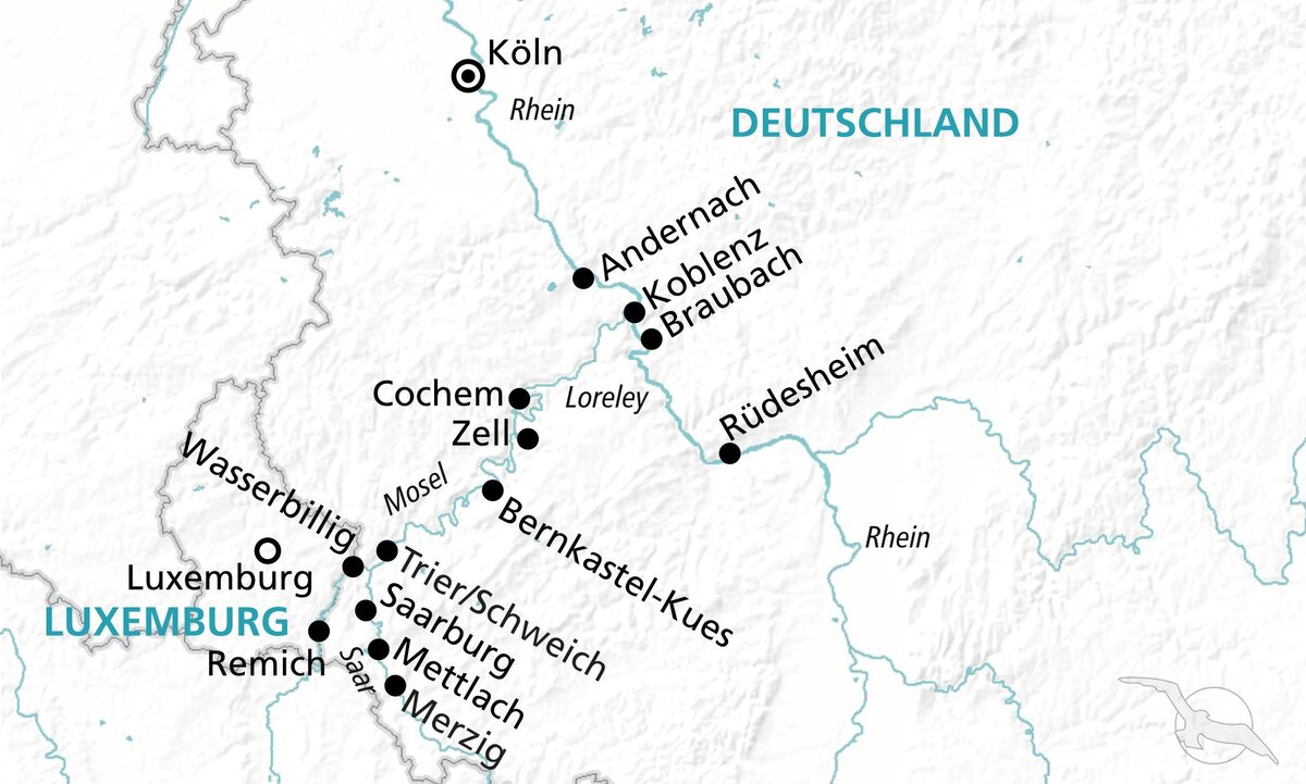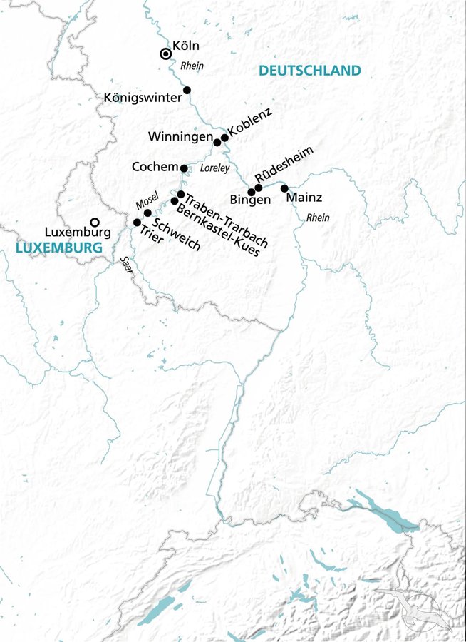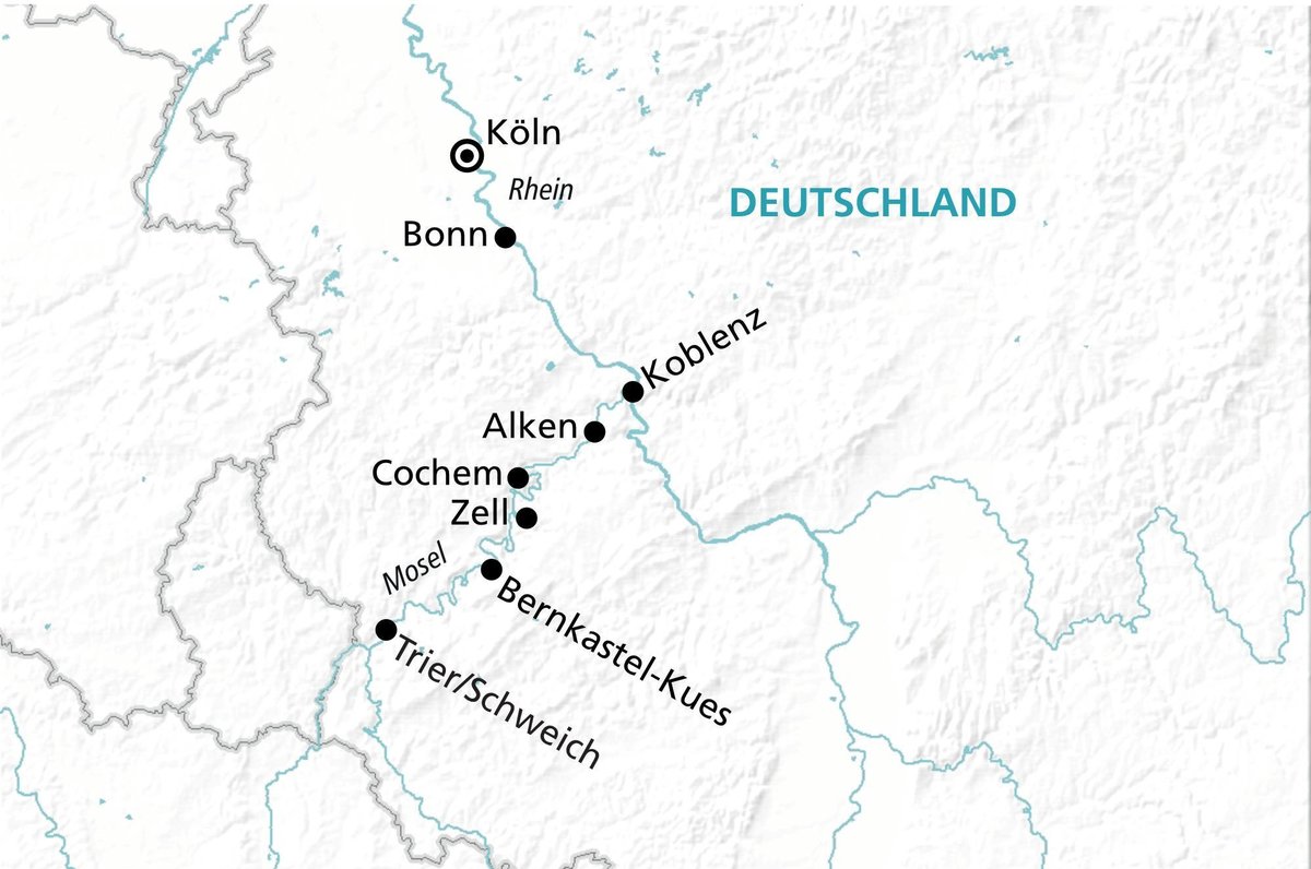 Warum nicht gleich eine Reise auf der Mosel mit drei anderen Flüssen kombinieren? In nur neun Tagen können Sie vier deutsche Flüsse kennenlernen: Main, Rhein, Mosel und Saar. Landschaftliche Schönheiten und lebhafte Städte bilden die perfekte Kombination für diese kurzweilige Reise. Von Frankfurt fahren Sie gen Mainz, bevor Ihr Schiff auf dem romantischen Teil des Rheins vorbei an Burgen und Schlössern Richtung Koblenz fährt. Am Deutschen Eck geht es in die Mosel. Die schönen Winzerorte Cochem, Bernkastel-Kues und Piesport sind Stationen Ihrer Mosel Flusskreuzfahrt auf dem Weg zu einer der ältesten Städte Deutschlands, Trier. Dann besuchen Sie das luxemburgische Remich mit Ausflugsmöglichkeiten nach Luxemburg-Stadt und in die Luxemburger Schweiz. Von Wasserbillig nimmt Ihr Schiff Kurs auf die Saar bis Mettlach, von wo aus die Passage der pittoresken Saarschleife mit einem Ausflugsschiff startet. Über Saar und Mosel, mit Stopps in Saarburg, Traben-Trarbach und Zell geht Ihre Reise wieder zum Rhein.