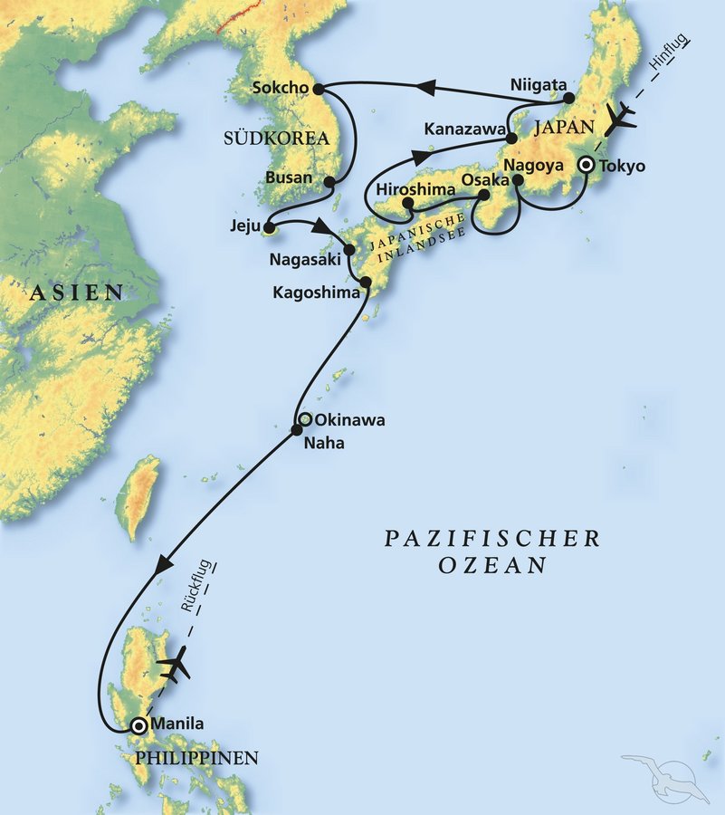 Etwas umfassender läßt sich Tokio während einer ganztägigen Rundfahrt erkunden. Ihr erstes Ziel ist der historische Stadtteil Asakusa mit dem Sensō-ji-Tempel, dem ältesten Tempel Tokios. Die Haupthalle wurde 645 erbaut, zur verborgenen Aufbewahrung einer winzigen goldenen Statue von Kannon, der Göttin der Barmherzigkeit. Das heutige Gebäude ist eine Rekonstruktion von 1958, nach der Zerstörung i.J. 1945. Nach dem Besuch und einem Spaziergang durch Asakusa nehmen Sie Ihr Mittagessen ein. Danach fahren Sie zum Meiji-jingū,-Schrein. Es handelt sich um einen Shinto-Schrein, der den Urgroßeltern des heutigen Kaisers gewidmet wurde. Der Schrein wird von einem Wald von etwa 700.000 Quadratmeter Fläche umgeben. Die ca. 120.000 Bäume wurden von Menschen aus ganz Japan während der Errichtung des Schreins gespendet. Sumo-Ringer, die den Rang eines Großmeisters erreicht haben, geben im Meiji-jingū-Schrein Schaukämpfe. Aufenthalt etwa 1 Std. Weiterfahrt zum hinter Gräben und dicken Mauern verborgenen Kaiserpalast. Auf beiden Seiten der Straße erstrecken sich Rasenflächen mit Pinienhainen. Auf der Nordseite befindet sich ein Brunnen, der an die Hochzeit des Kaisers und der Kaiserin erinnert und in südlicher Richtung befindet sich eine Bronze von Kusunoki Masashige, einem kaisertreuen Samurai aus dem 14. Jh. Die östlichen Gärten sind zugänglich, während die kaiserliche Residenz nicht besichtigt werden kann. Der Palast selbst ist nicht zu sehen. Nach dem etwa 1-stündigen Aufenthalt erfolgt die Rückfahrt zum Schiff.
