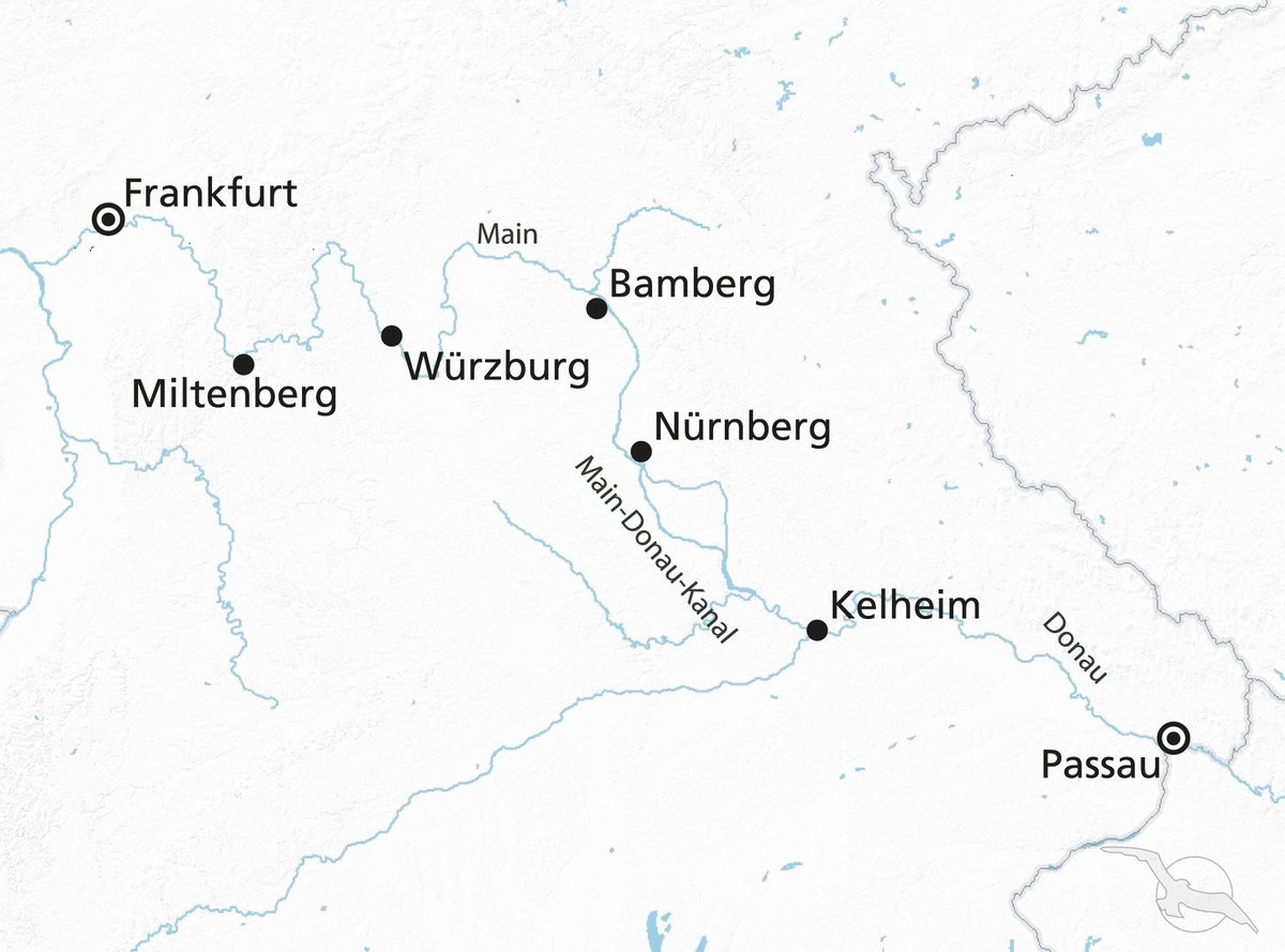 Während dieser siebentägigen Flusskreuzfahrt mit unserem komfortablen Schiff Alena bieten sich Ihnen schönste Impressionen von Main und Main-Donau-Kanal. Sie starten in der hessischen Metropole Frankfurt und beenden Ihre Reise in der Dreiflüssestadt Passau. An Land erwarten Sie faszinierende Ortschaften und Städte wie das historische Miltenberg, Würzburg mit der UNESCO-geschützten Residenz, das oberfränkische Bamberg mit einer beeindruckenden Altstadt sowie die Lebkuchenstadt Nürnberg. Diese Reise, mit einer hervorragenden Mixtur aus kulturellen Höhepunkten und wunderschönen Natureindrücken, ist rundum ein gelungenes Erlebnis!