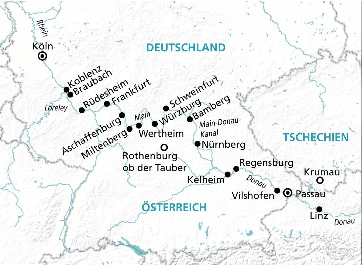 Entlang des Mittelrheins genießen Sie ein Panorama mit unzähligen Burgen. Vorbei am Loreley-Felsen steuert Ihr Schiff in den Rheingau mit den von Weindörfern gesäumten Ufern. Am Rande des Spessart entlang führt der Main Sie auf eine erlebnisreiche Fahrt durch malerische Landschaften sowie zu den schönsten Städten Frankens. Von Würzburg aus durchfahren Sie das fränkische Weinland mit Kurs auf Nürnberg. Von überraschender Schönheit ist das Altmühltal, bevor Sie ab Kelheim den eindrucksvollen Donaudurchbruch besuchen. Das alte Regensburg ist eine weitere Perle. Im Walzertakt geht es die Donau entlang bis Passau. Die ehemalige Kulturhauptstadt Linz verführt Sie mit Charme und kreativer Vielfalt.
