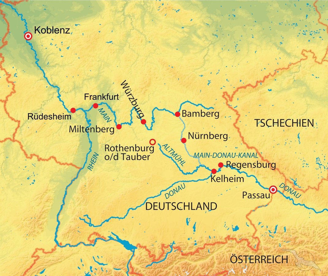 Sie starten Ihre Urlaubsreise in Passau. Ihr erstes Ziel ist die wunderschöne Stadt Regensburg. Ab Kelheim besuchen Sie den eindrucksvollen Donaudurchbruch, von überraschender Schönheit ist dann die Fahrt durch das Altmühltal. Von Nürnberg aus durchfahren Sie das fränkische Weinland und nehmen Kurs auf die Residenzstadt Würzburg. Am Rande des Spessart entlang führt der Main Sie auf eine erlebnisreise Fahrt durch malerische Landschaften sowie zu den schönsten Städten Frankens. Ihr Schiff steuert in den Rheingau mit von Weindörfern gesäumten Ufern, vorbei am Loreley-Felsen. Entlang des Mittelrheins genießen Sie ein Panorama mit unzähligen Burgen, bevor Ihre Reise in Koblenz am berühmten Deutschen-Eck endet.