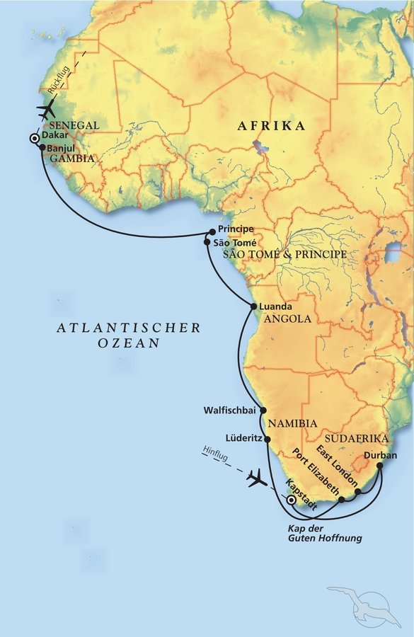 Diese Tour vermittelt einen ersten Eindruck der Hauptstadt Angolas. Angola stand bis November 1975 unter Kolonialherrschaft. Nach seiner Unabhängigkeit begann der Konflikt zwischen zwei angolanischen Fraktionen, der erst 2002 nach 27 Jahren beigelegt werden konnte und mehr als 500.000 Menschen das Leben kostete. Dieser Bürgerkrieg war einer der längsten bewaffneten Konflikte des Kalten Krieges, in den ebenfalls kubanische wie auch südafrikanische Streitkräfte involviert waren. Heute erlebt Luanda dank riesiger Bodenschätze an Öl und Diamanten eine Renaissance besonderen Ausmaßes. Ihre Fahrt führt Sie an der Marginal Bay entlang, durch das Wirtschaftszentrum der Stadt bis zur kleinen schönen Kirche Igreje de Senhora de Nazaré (Fotostopp). Weiter geht es zum 1576 erbauten Fort San Miguel, das den Hafen und die Stadt vor französischen, spanischen sowie niederländischen Angriffen schützen sollte (Außenbesichtigung). Danach geht es zur Ilha de Luanda, einer schmalen Nehrung, die sich über eine Länge von 9 km erstreckt und zwischen dem Atlantischen Ozean und der Bucht von Luanda gelegen ist. Sie fahren weiter zum einzigartigen Agostinho-Neto-Mausoleum mit dem riesigen Obelisken (Fotostopp), bevor Sie zum Schiff zurückkehren.