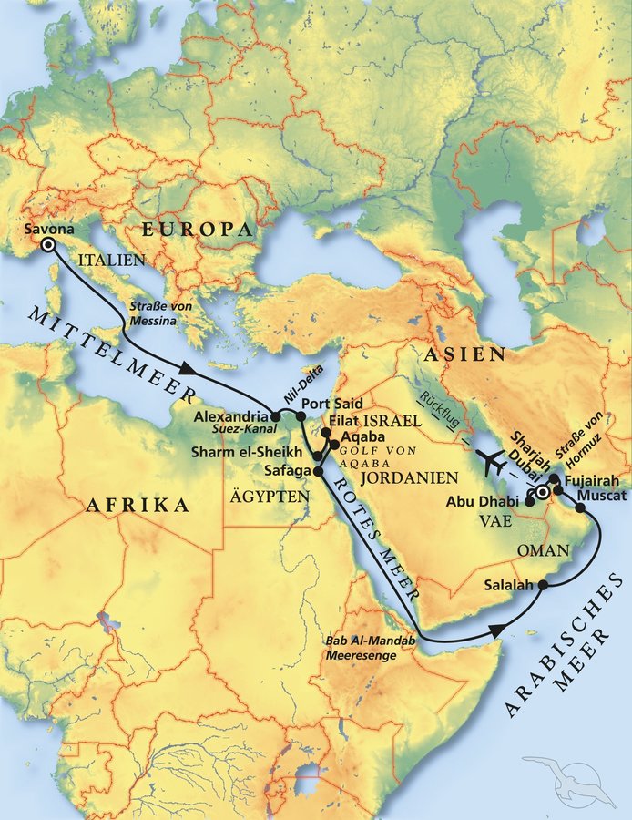 Etwa 1,5-stündige Busfahrt nach Nakhl. Sie besichtigen eine Festung, die vor einigen Jahren liebevoll restauriert wurde, und genießen herrliche Ausblicke auf die karge Berglandschaft. Die Festung liegt auf einem 70 m hohen Fels und wurde im 3. Jh. von den Persern erbaut. Noch heute kann man zu bestimmten Tageszeiten den omanischen Frauen während der Hausarbeit im Freien zusehen und die traditionellen Trachten bewundern. Anschließend legen Sie einen Stopp an den heißen Quellen ein, die aus den Felsen am Flussbett heraussprudeln. Mittagessen unterwegs in einem Hotel. Wenn es die Zeit erlaubt, haben Sie Gelegenheit den hoteleigenen Pool zu nutzen oder einen Spaziergang zu unternehmen. Nach der Rückfahrt nach Muscat kurzer Stopp mit etwas Zeit zur freien Verfügung am geschäftigen Muttrah Souk. Rückkehr zum Schiff.