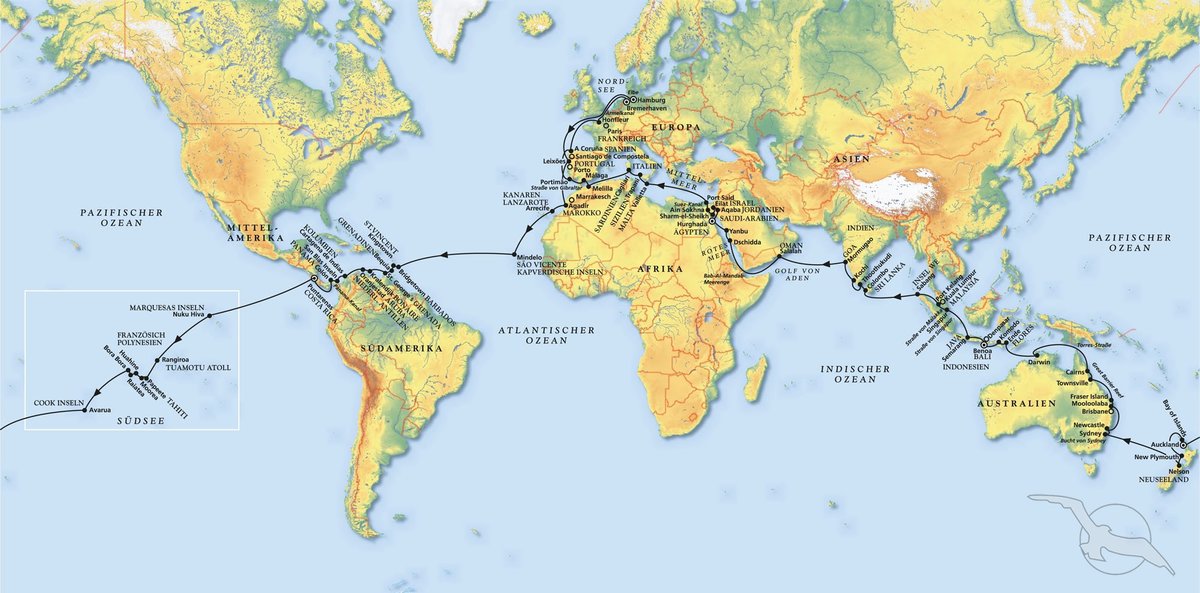 Hamburg - Rio de Janeiro - Puerto Madryn - Ushuaia - Buenos Aires - Valparaiso - Moorea - Papeete - Bora Bora - Maui (Hawaii) - Los Angeles - Acapulco - Panama-Kanal - Montego Bay Saint Kitts - Hamilton (Bermuda) - Faial (Azoren) - Portsmouth (London) - Bremerhaven