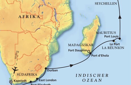 Durban ist die dritttgrößte Stadt Südafrikas und mit dem größten Hafen des Kontinents bedeutendes Wirtschaftszentrum. Das subtropische Klima und die ca. 300 Sonnentage im Jahr ziehen ganzjährig Touristen an. Die Bevölkerung ist sehr kosmopolitisch und besteht aus Asiaten, Afrikanern und Europäern. Seinen Namen erhielt Durban vom ehemaligen Gouverneur der Provinz Natal, Sir Henry d'Urban. Sie fahren zunächst zum Rathaus, das vom Architekten Stanley Hudson im Neobarock entworfen wurde. Das majestätische Gebäude, Anfang des 20.Jh. erbaut, ist Anziehungspunkt für viele Besucher. Weiterfahrt zum Indischen Viertel. Auf den schmalen Gehsteigen werden Gewürze, Saris, Weihrauch, Schmuck, Sandalen etc. feilgeboten. Sie haben etwa 1 Std. Zeit zur freien Verfügung für individuelle Erkundungen. Weiterfahrt zum Botanischen Garten, dem ältesten in Afrika. An den Ausläufern der Berea-Hügelkette wurden die Gärten 1949 angelegt, zunächst zum Zwecke der Kultivierung von Nutzpflanzen. Heute können Besucher die einheimischen und exotischen subtropischen Anpflanzungen bewundern, u.a. eine Palmen- und Orchideensammlung sowie majestätische, teilweise mehr als hundert Jahre alte Bäume. Darüber hinaus sind mindestens fünfzig verschiedene Vogelarten in den Gärten heimisch. Nach dem knapp 1-stündigen Aufenthalt passieren Sie auf der Rückfahrt zum Schiff noch das Moses Mabhida Stadion.